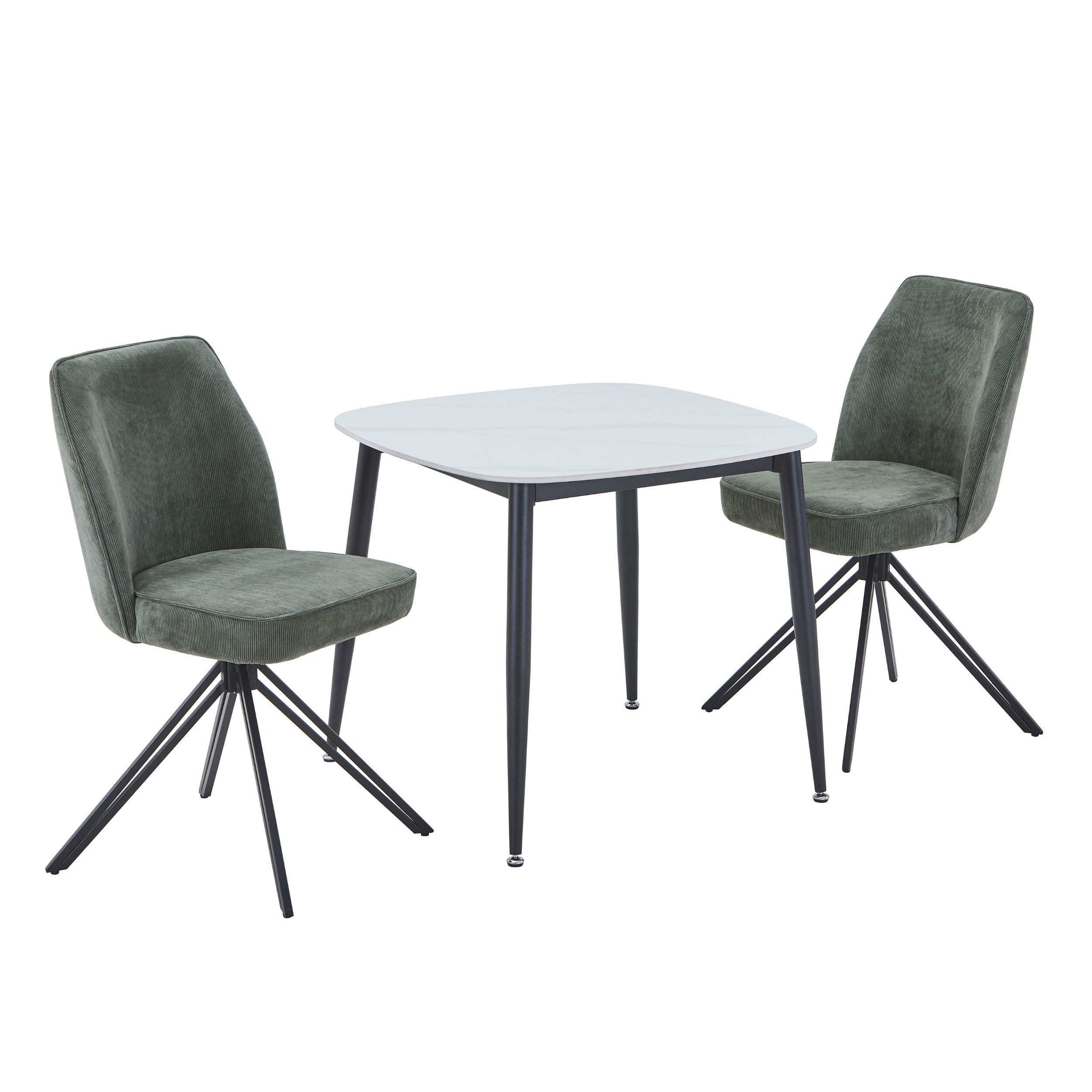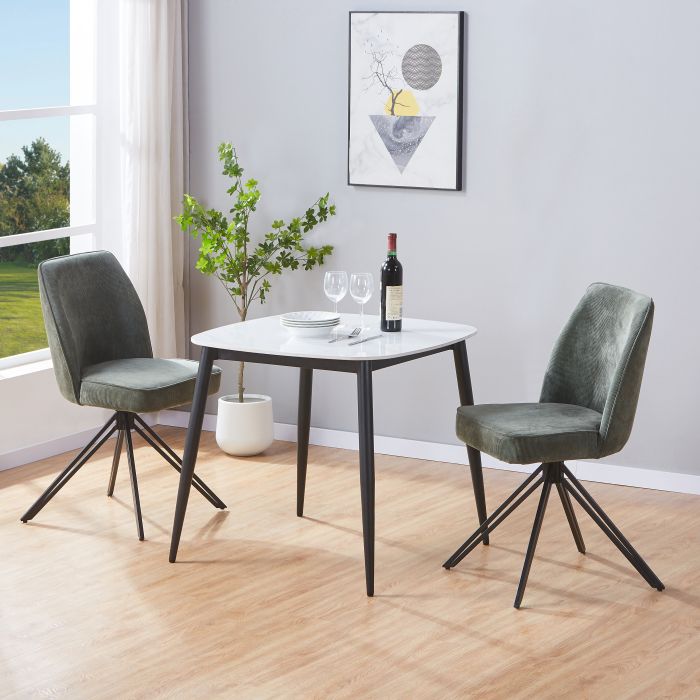 NEXO Sintered Stone Square Dining Table with 2 Swivel Fabric Chairs - Gloss White with Green