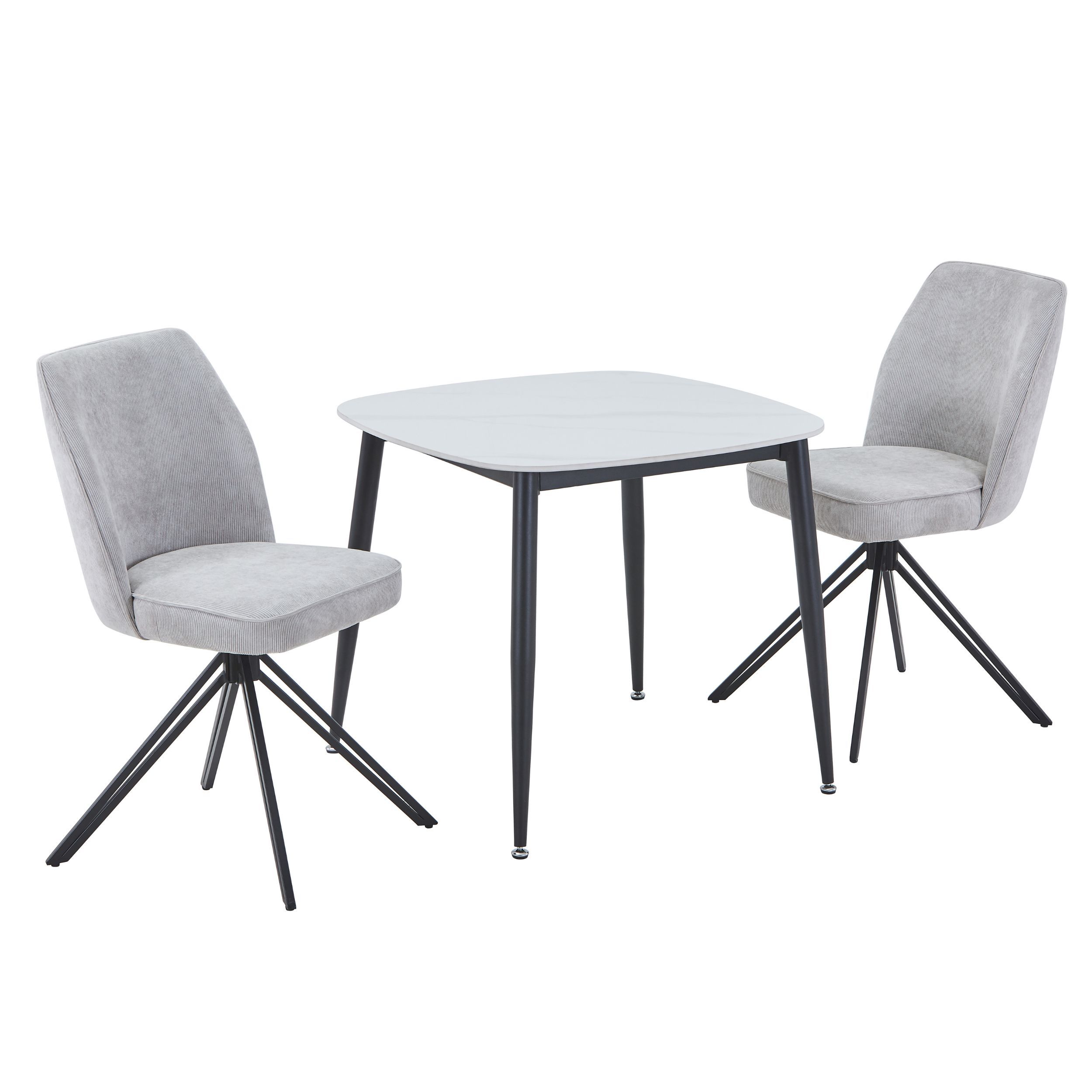 NEXO Sintered Stone Square Dining Table with 2 Swivel Fabric Chairs - Gloss White with Light Grey