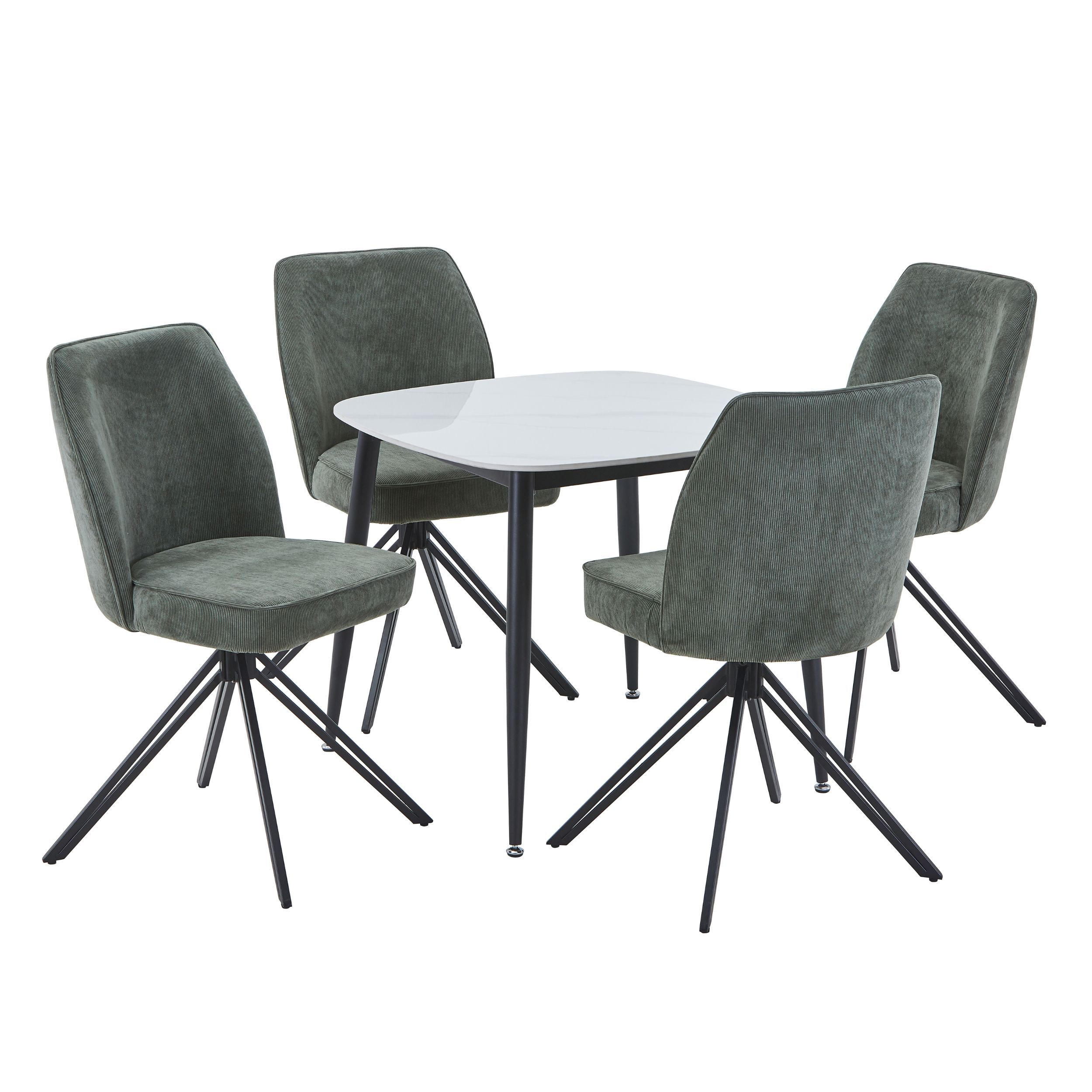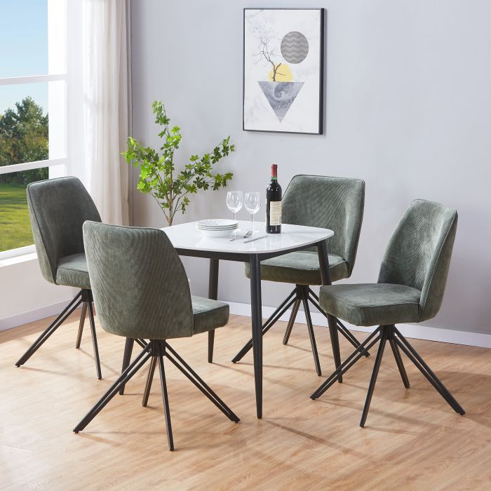 NEXO Sintered Stone Square Dining Table with 4 Swivel Fabric Chairs - Gloss White with Green