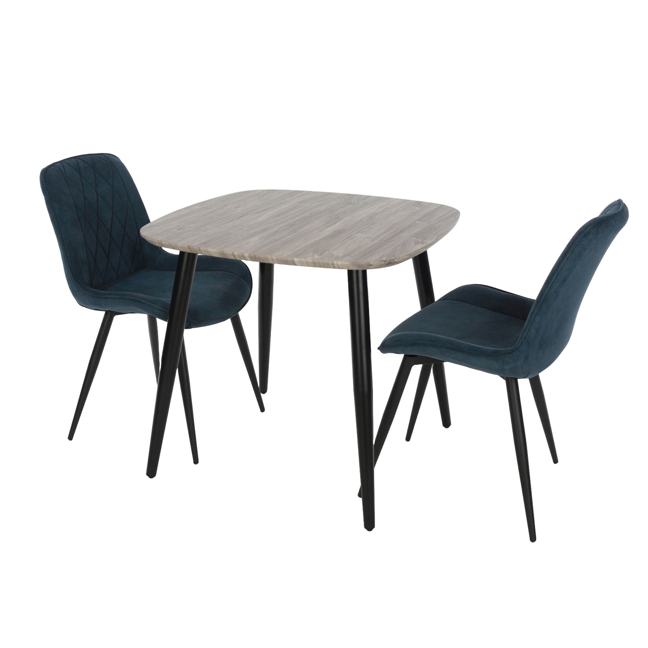 NEXO Square Dining Table with 2 Diamond Stitch Fabric Chairs - Grey Oak with Blue