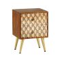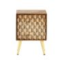 Side Table with 2 Drawers, featuring CNC cuts on the front of each drawer, matching wooden handles and angled metal legs. The unit will come fully assembled, only the legs must be attached.
