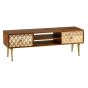 Large Plasma TV Stand with 2 Shelves in the centre and 2 Drawers on the sides, featuring CNC cuts on the front of each drawer, matching wooden handles and angled metal legs. The unit will come fully assembled, only the legs must be attached.