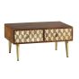 Rectangular Coffee Table with 2 Drawers, featuring CNC cuts on the front of the drawers, matching wooden handles and angled metal legs. The unit will come fully assembled, only the legs must be attached.