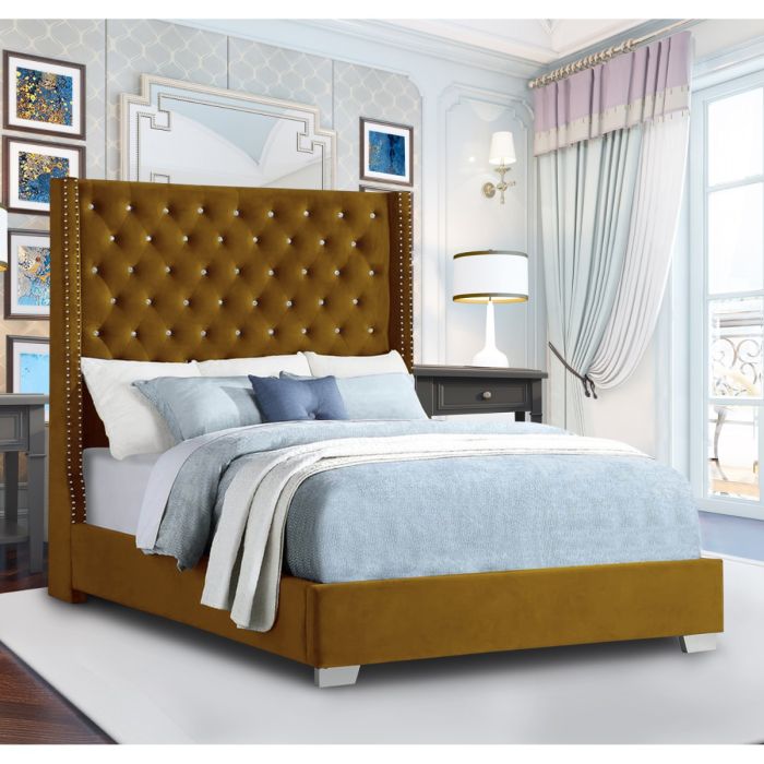 Elegant and eye-catching, the stunning bed is the perfect addition to your bedroom. This bed is upholstered in rich Velvet that is complimented by a crystal-tufted design. The bed features velvet-upholstered headboard with crystal buttons, beaded wing panels which truly makes this unique. Strength and beauty is guaranteed with a solid wood frame and chrome metal legs.