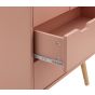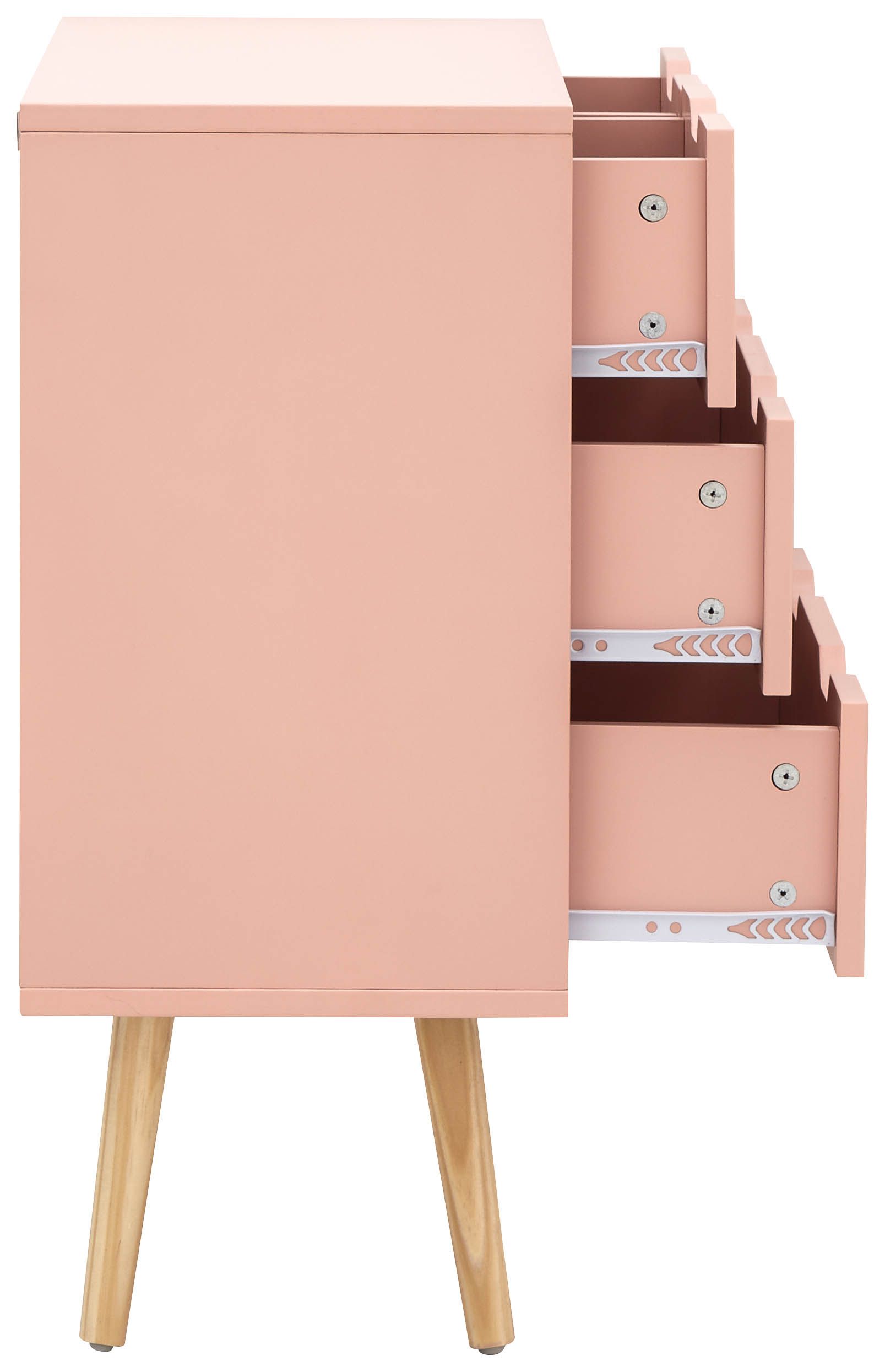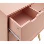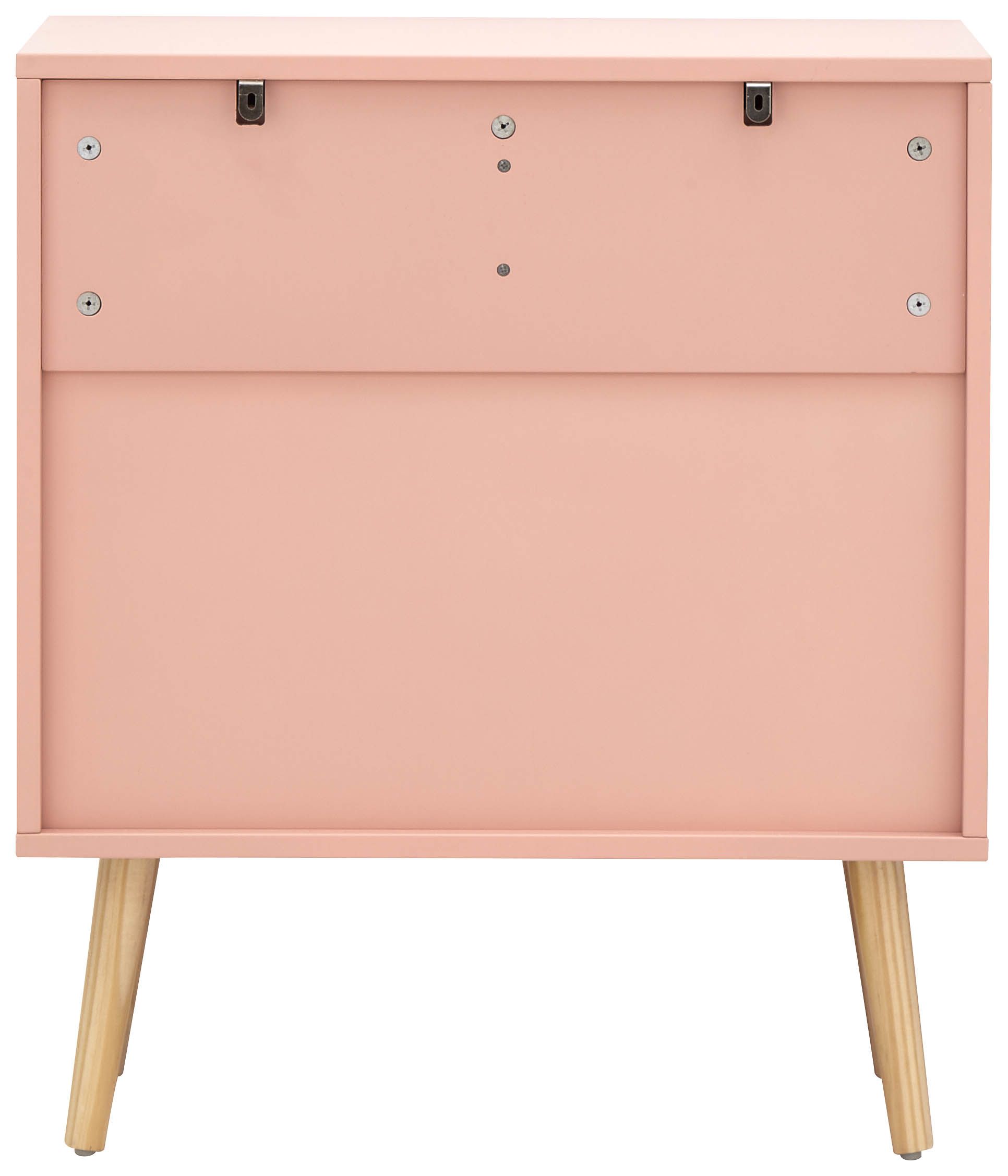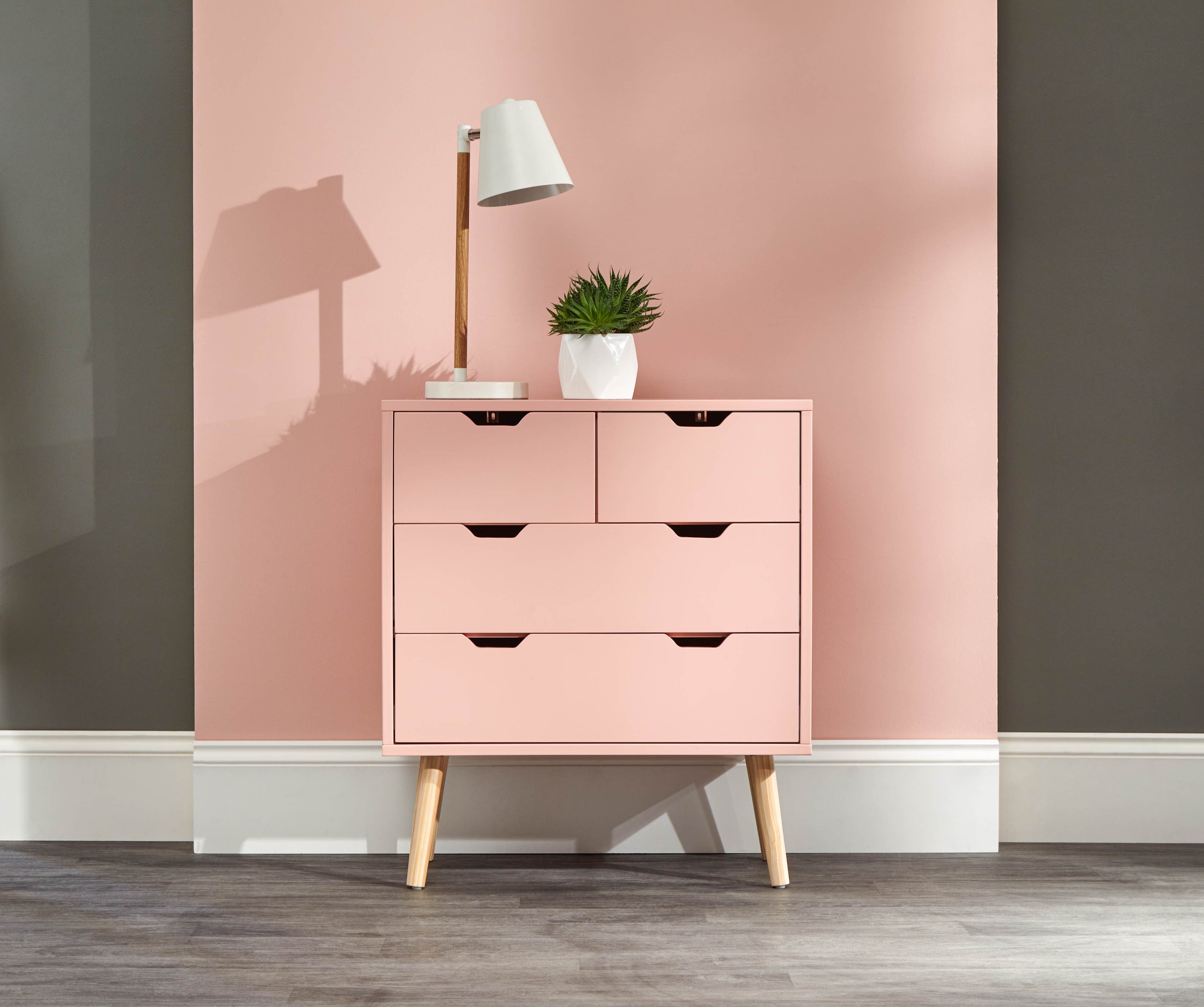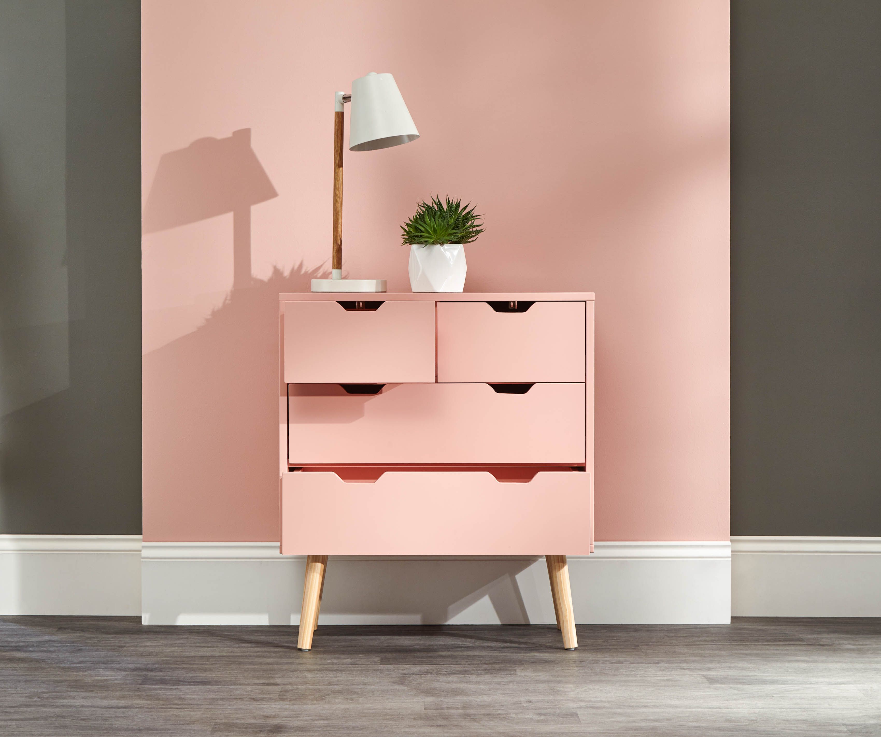 Transform your bedroom with a classic 4-drawer chest in a modern Scandi design that's ideal for a style-conscious contemporary space. The simple construction offers two full-width and two half-width drawers, each with neat cut-out handles. The smooth painted finish is including the new season's warm pink and mounted on slender mid-century-inspired pale-wood legs. A timeless choice.