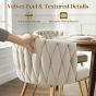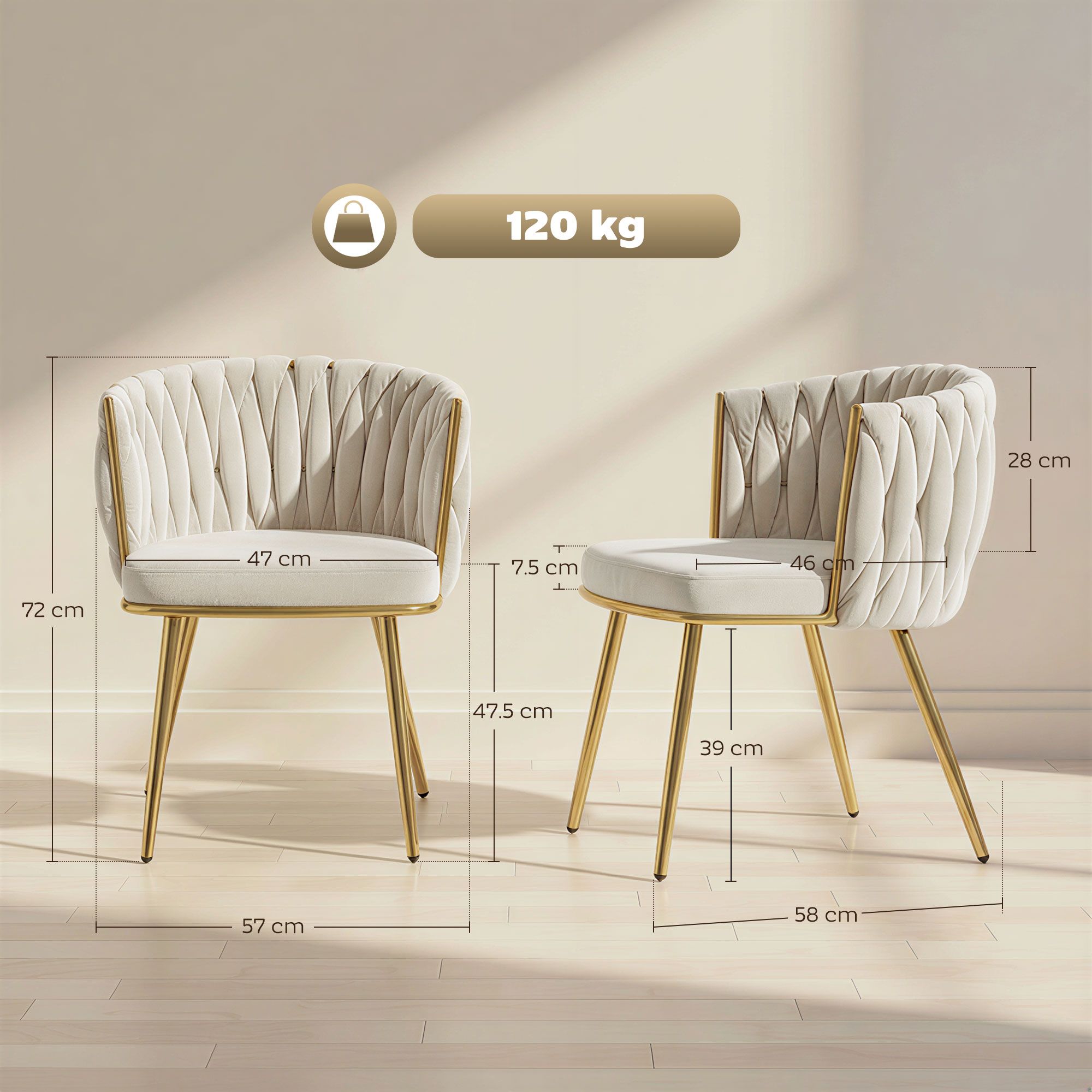 Velvet and woven craft: the woven back of these two dining room chairs is crafted with soft and breathable velvet-feel fabric, creating a tactile, elegant texture that enhances comfort and visual appeal. Enveloping comfort: the wrap-around backrest, filled with soft pp cotton, and a 7. 5 cm thick natural sponge seat cushion hug your body, ensuring these dining chairs keep you comfortable through long conversations well after dinner. Strong and stable design: built on an electroplated steel frame with tapered legs supporting up to 120 kg, these kitchen chairs have adjustable foot pads on each leg to prevent scratches and ensure stable seating on any surface. Elegant quilted design: the curved backrest with a refined woven pattern and slender gold tone legs creates a graceful silhouette, adding a touch of modern luxury and timeless charm to your dining room, vanity corner, or reading nook. Dimensions: 72 H x 57 W x 58 D cm. 5 H x 47 w x