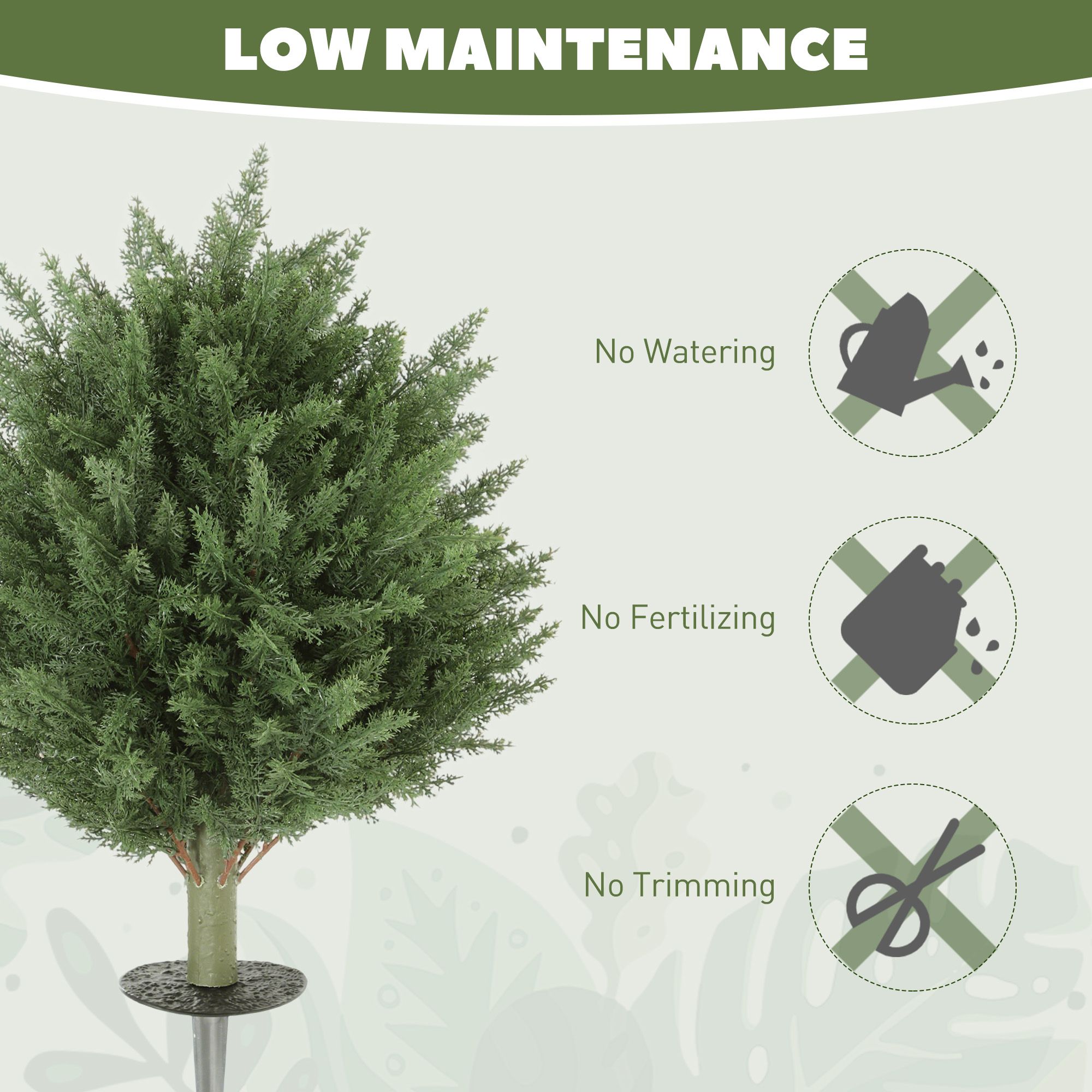Lifelike appearance: each artificial cypress tree of the set features 387 lush leaves, offering a realistic and dense appearance, great for any space needing a touch of greenery. Versatile placement: complete with ground stakes, these fake outdoor plants can be easily placed in flower pots or directly inserted into the ground, great for driveways, porches, or balconies. Uv protected foliage: crafted from uv-resistant pe material, these fake trees ensure vibrant colour and structural integrity against the elements, making them suitable for both indoor and outdoor use. Maintenance-free: enjoy the beauty of nature without the hassle with these artificial plants for decor; no watering, pruning, or care required, just everlasting green freshness. Product information: overall dimension: dia. 40 x 60 cm. Ground stake dimension: dia. 11. Easy to assemble