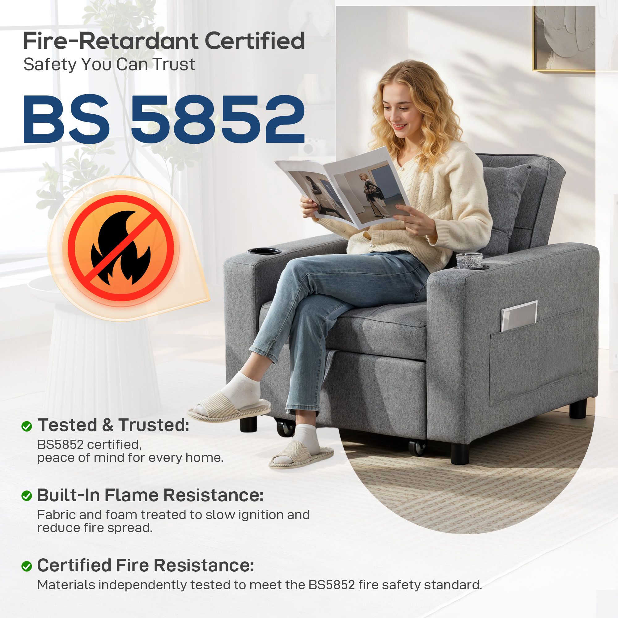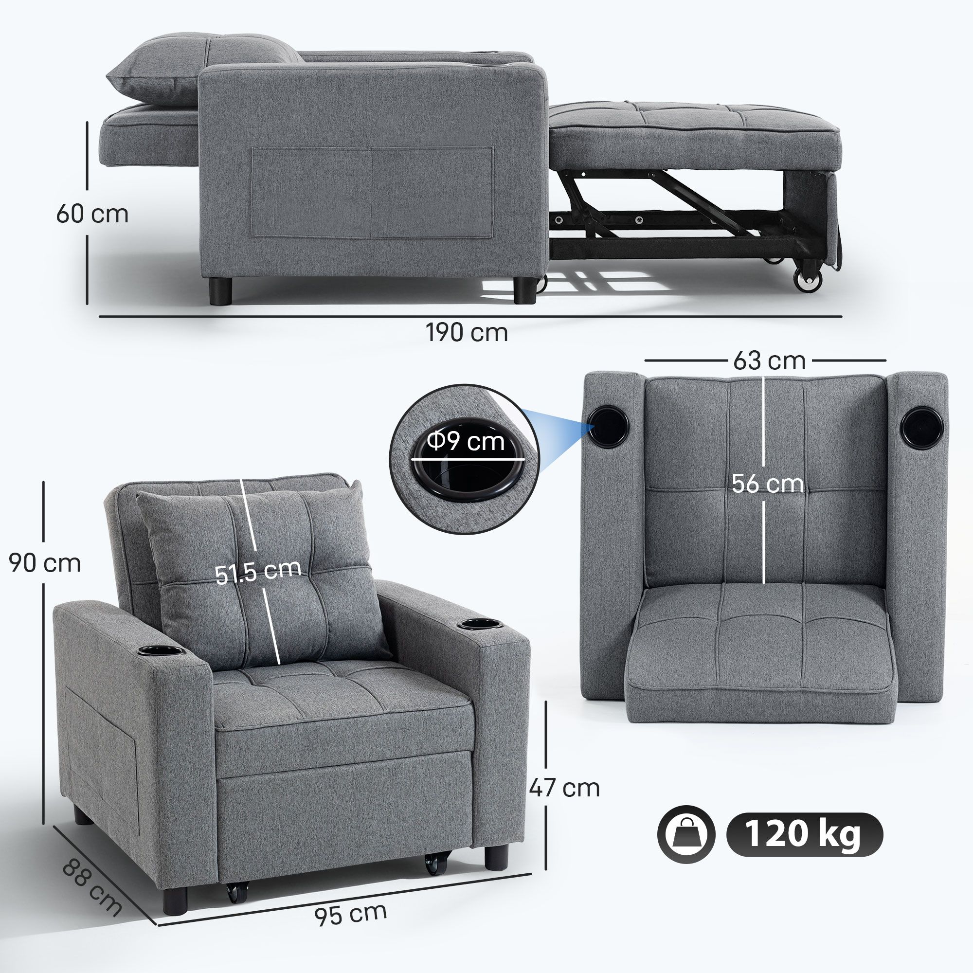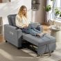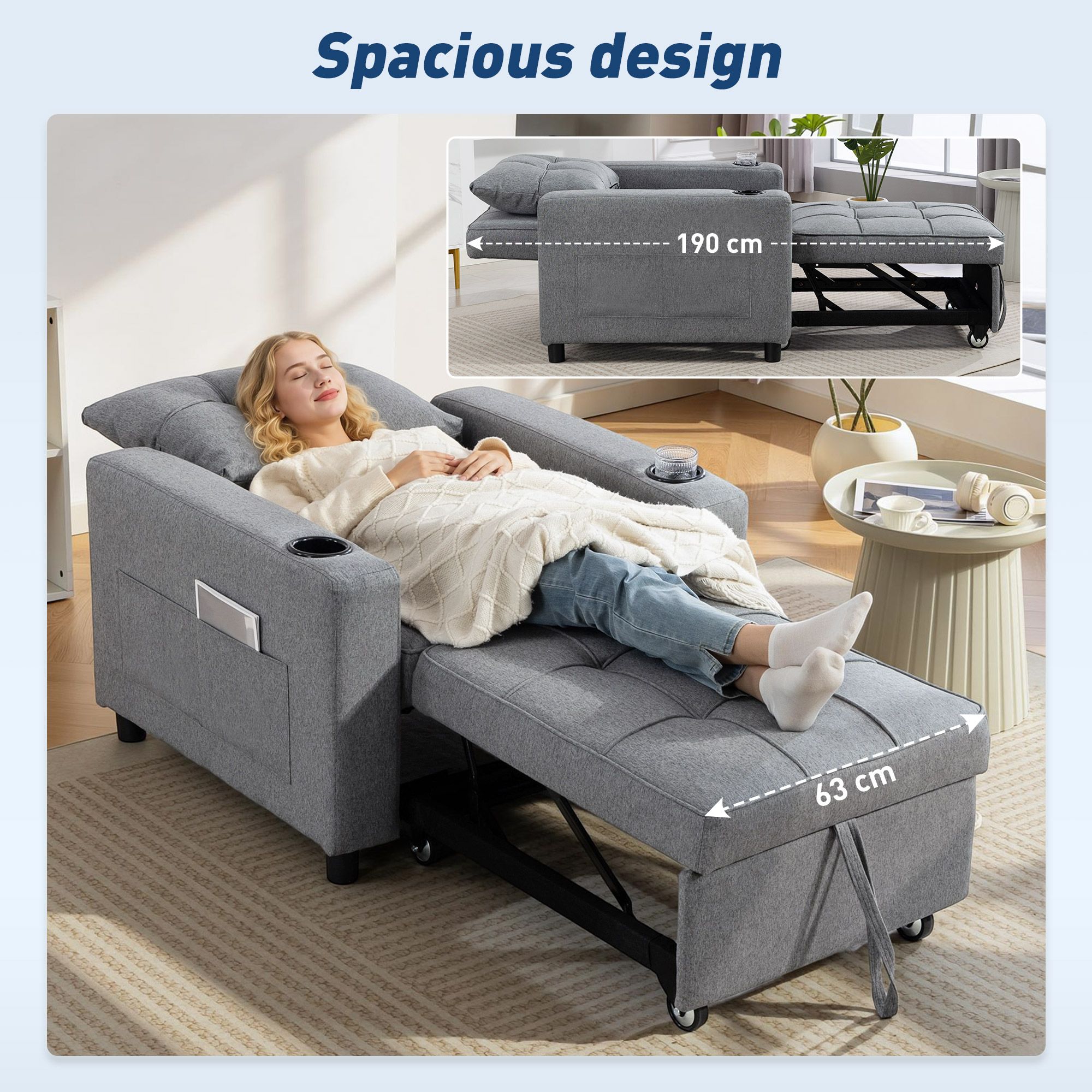 3-in-1 design: from an armchair, to a lounge recliner and single bed - easily changes via the pull-out design. Use this piece how you wish, to relax how you want in your living room, office, bedroom and other spaces. 95 x 190 cm sofa bed size: offering plenty of room to sleep and rest - even taller people. Filled with high-density foam, sofa bed is a comfortable piece which retains shape. Wrapped in smooth linen-look upholstery. Three-level back: set chair bed to sit upright, recline or lie flat - relax in the position you want. For watching tv, reading, resting and more. Pillow included for added comfort and support. Cup holders and side pockets: practical extra features - store drinks, magazines and remotes within reach. No need to move from bed chair once you're settled and comfortable. Solid wood frame: this sleeper chair offers exceptional strength and stability, ensuring it withstands daily use. Enjoy peace of mind during everyday lounging
