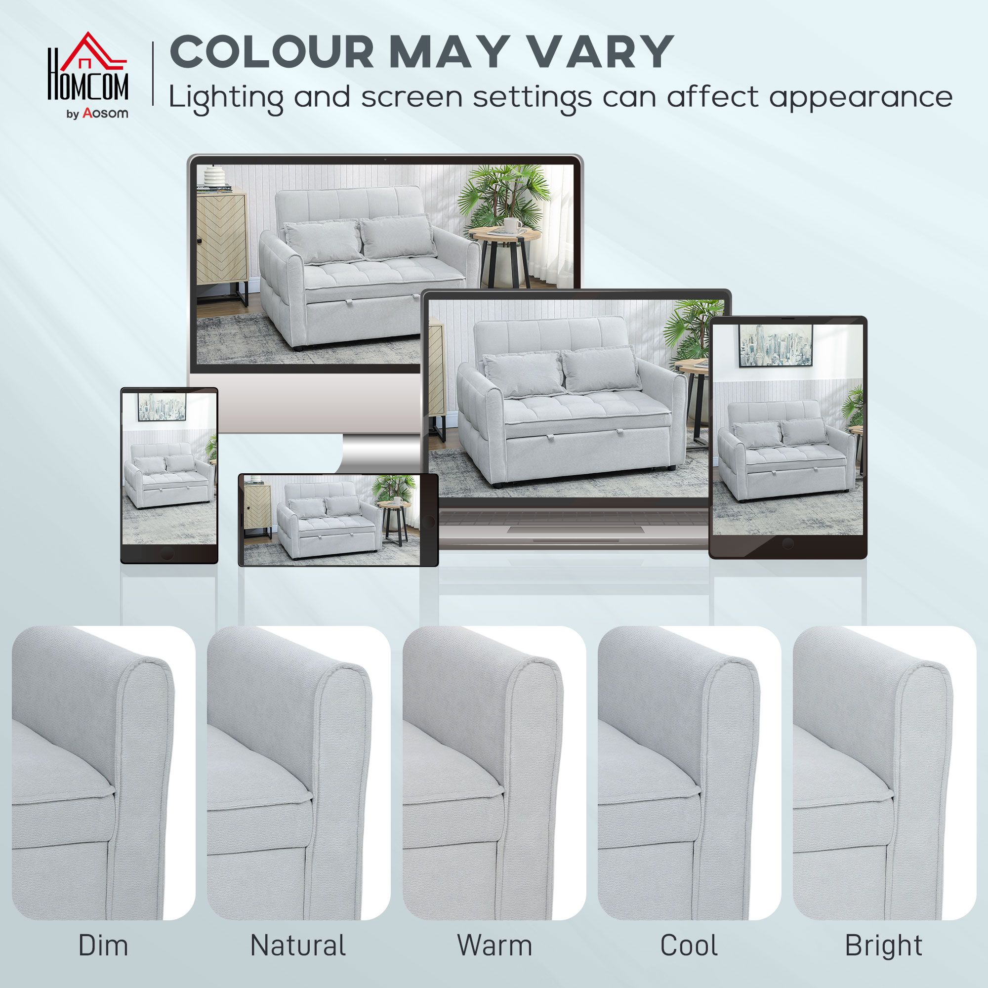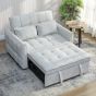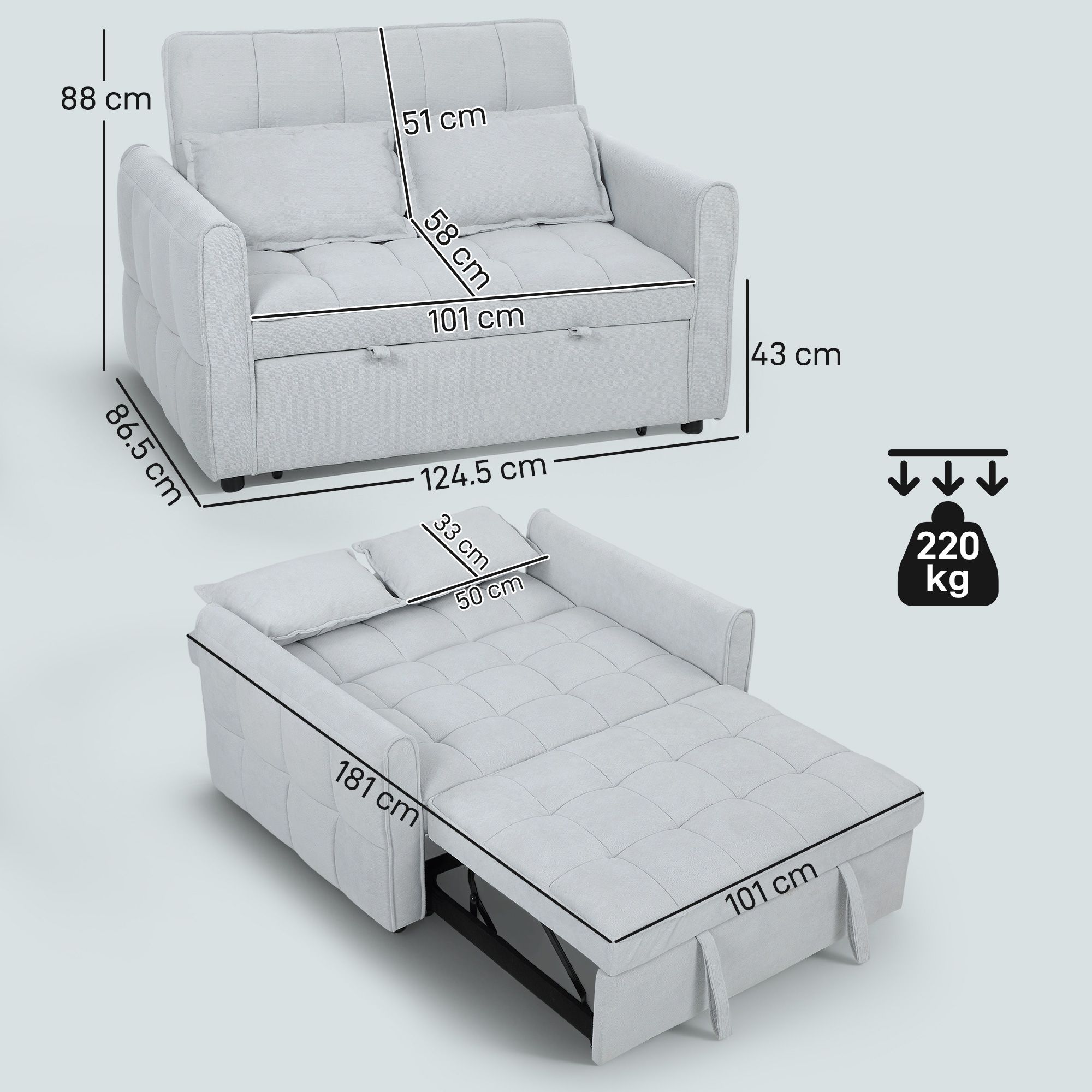Three-in-one convertible design: easily converts from a two seater sofa to a single bed and a recliner. Smooth pull-out mechanism allows effortless conversion, maximising every inch of your compact living room, guest room, or home office. Three-level adjustable backrest: adjust the sleeper sofa's click-clack backrest to 105°, 140° or 180° for sitting, lounging or sleeping. Two pillows provide extra support, ensuring a cosy and personalised seating or sleeping experience. Corn velvet-feel fabric & high-density foam: this two seater sofa bed offers a soft, cosy touch and a 14. 5 cm thick foam seat with s springs and elastic bands. Its tufting grid design adds both a stylish look and enhanced support without sagging. Solid wood and metal frame: this pull out sleeper sofa provides reliable stability and long-lasting durability for daily use, offering peace of mind for sitting or sleeping. Dimensions: 88 H x 124. 5 D cm (sofa), 43 H x 101 W x 181 D cm (bed). Weight