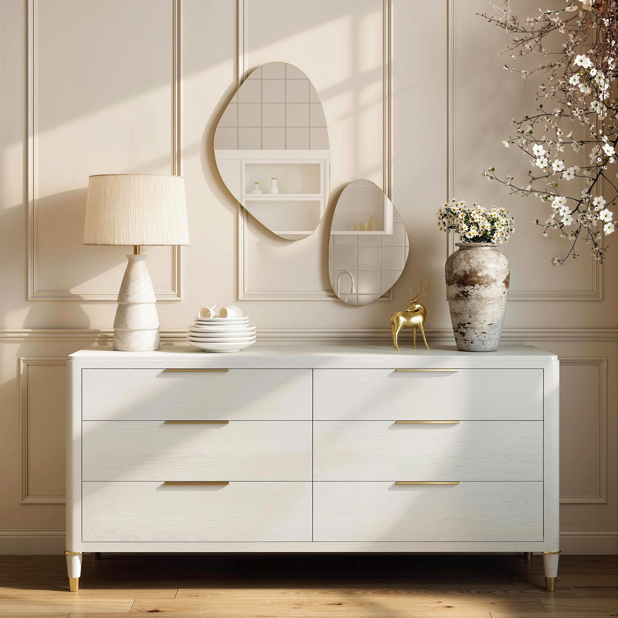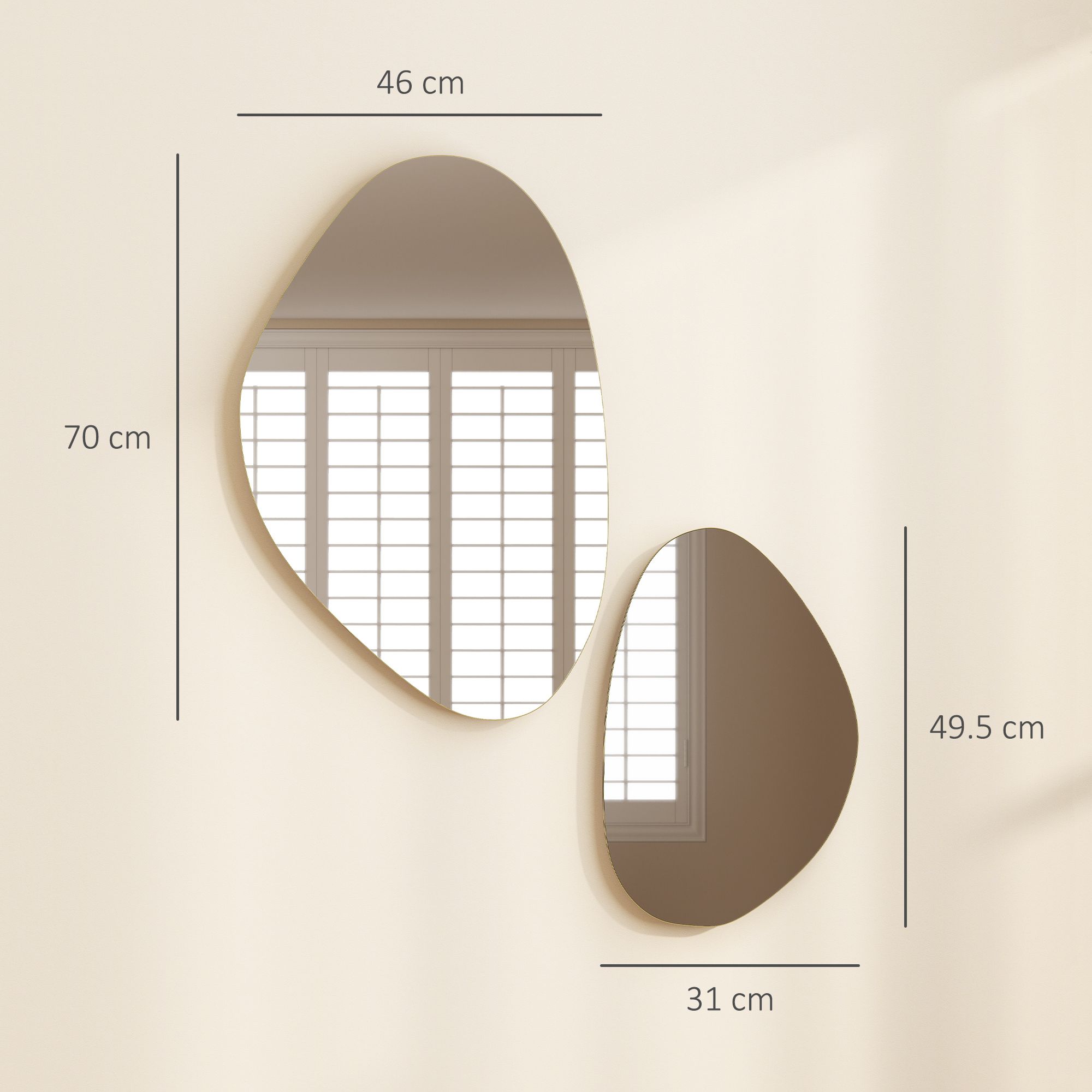 Pebble-shaped elegance: this distinctive pair of wall mirrors features bright metal frames that enhance modern and stylish appeal, refreshing your space with creative flair while bringing harmony and coordinated elegance to any room. Refined craftsmanship and clarity: featuring a metal frame, melamine-faced mdf, and smooth glass, this hanging mirror provides high-definition reflection with lasting elegance, ensuring a bright, spacious feel and a touch of excellence in your home decor. Stylish for any space: optimal for living rooms, bedrooms, hallways, or entryways, these irregular mirrors enhance any area with a personalised touch and artistic charm, creating a warm and inviting atmosphere wherever they are placed. Easy to hang: each hallway mirror is equipped with hooks for horizontal or vertical hanging, making it simple to install and arrange to suit your style. Gift for loved ones: this set of two wall mirrors, measuring 70 L x 46 W x 2. 5 D cm, makes a stylish and practical gift for friends, partners,