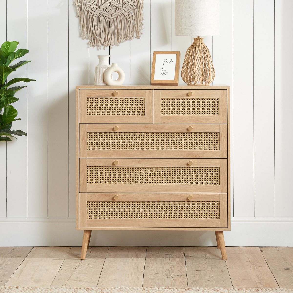 CARDANO Oak Finish Rattan Chest of Drawers - Medium-sized, 5 Drawers