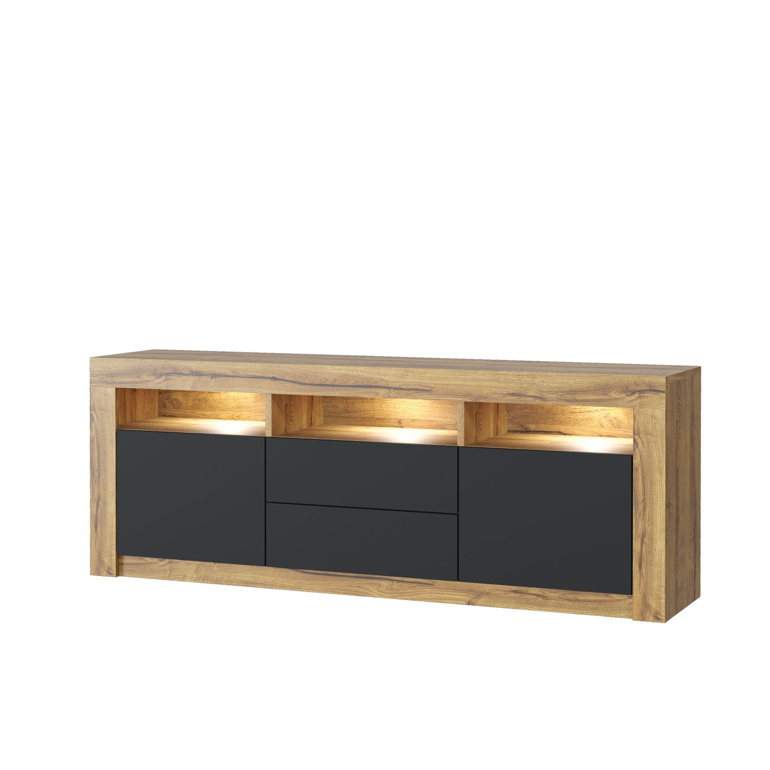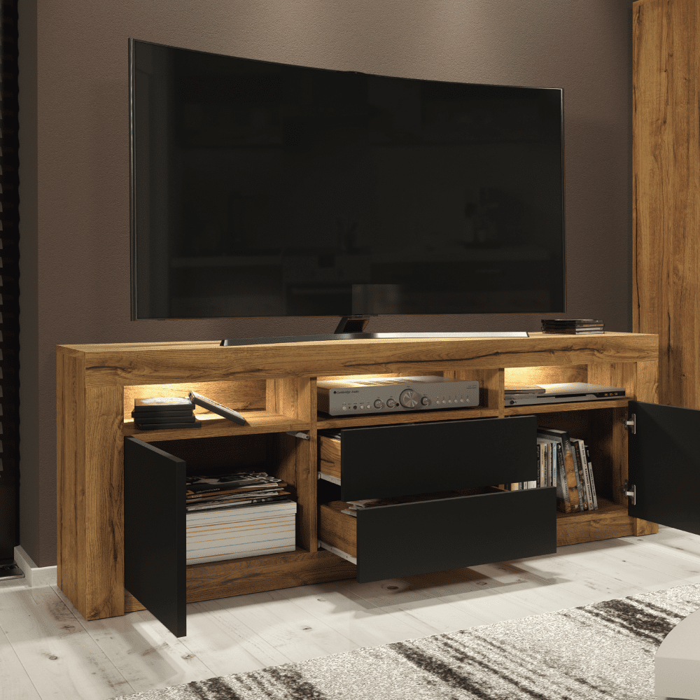 The OASIS TV Unit is a stunning centerpiece for any living room, combining modern design with functional storage to elevate your entertainment setup. Measuring 160cm (W) x 60cm (H) x 35cm (D), this spacious unit offers a perfect balance of style and practicality, making it an ideal choice for larger spaces. At the center of the unit, two generously sized drawers provide convenient storage for remotes, game controllers, or everyday items, ensuring a tidy and organized space. Above the drawers, open compartments are designed to accommodate media devices or decorative pieces, and LED lights included in the set softly illuminate these areas, creating a warm and inviting ambiance. Please note: the Oak with Black version features matte black doors, providing a unique and stylish alternative to the glossy finishes available in other combinations. Available in White & Gloss Doors, White & Grey Gloss Doors, Black & Gloss Doors, Walnut & Black Gloss Doors, Oak & White Gloss Doors, Oak & Black Matt Doors, and Dark Grey & Gloss Doors.