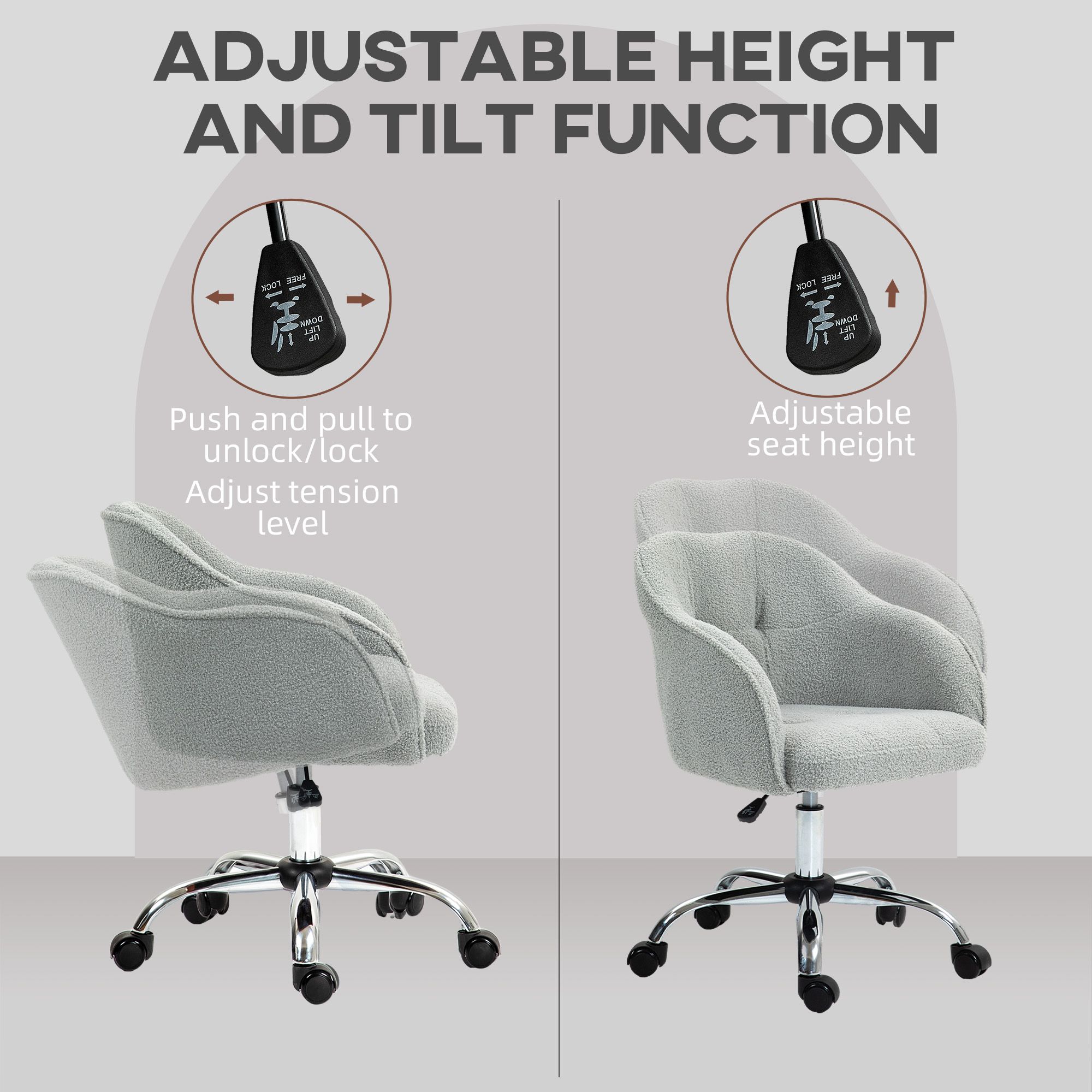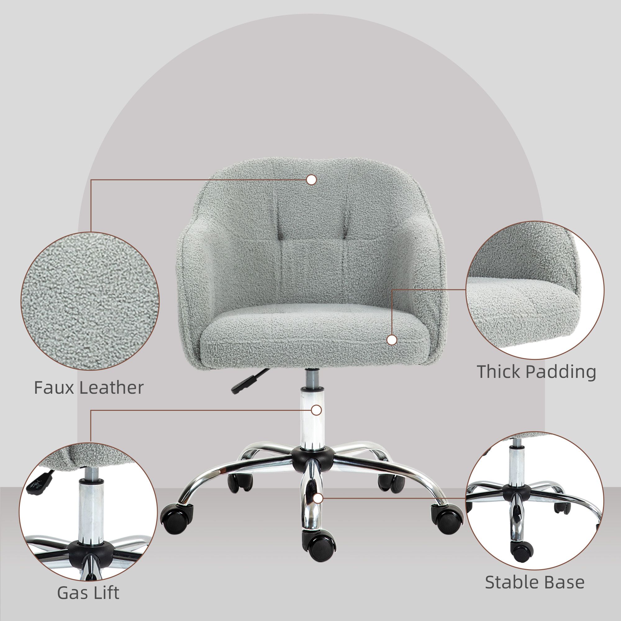 Snuggle into the work day with this PUERTO office desk chair. The seat is wrappy in a teddy texture of the faux fleece upholstery: it's super soft. You can adjust the seat height between 46-56cm, so you can sit at a level you want. Filled with sponge to sit comfortably, with a tall back and armrests for support, this small office chair is complete with five wheels to move it around easily.