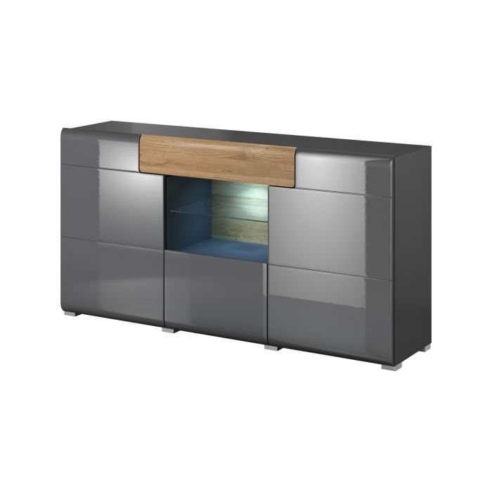 The Toledo 26 is a stylish sideboard cabinet that impresses with its high-quality craftsmanship and combines three hinged doors, one glass shelf and one drawer for storage. Available in two different colours - white or grey matt with San Remo Oak veneer, it will effortlessly blend in any modern or contemporary decor. The soft lines and subtle interplay of shadow and light make this unit stand out in any room.