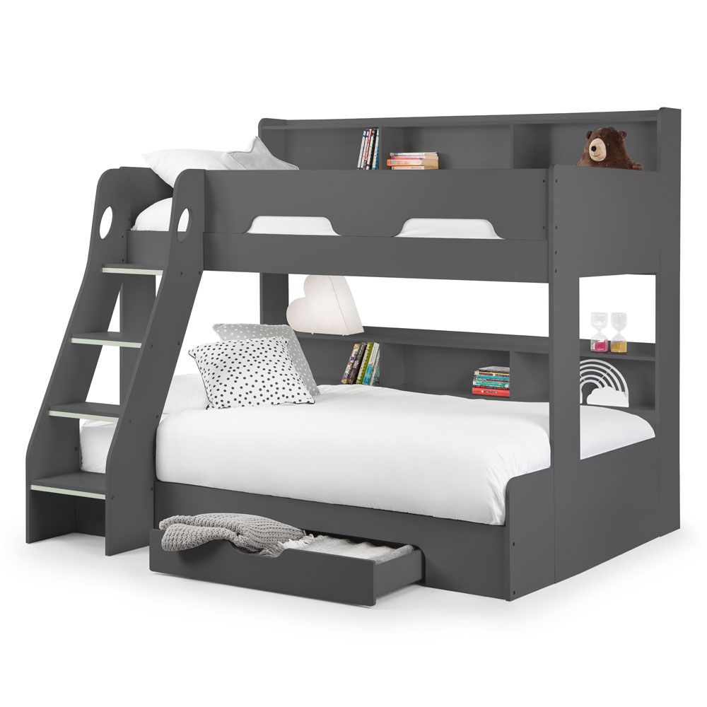 The Orion Triple Bunk is available in a modern Anthracite finish. The Orion combines style with great practicality and includes a handy pull-out drawer and extensive shelving for kids' books and toys, with a subtle raised lip to prevent anything slipping down the back.
