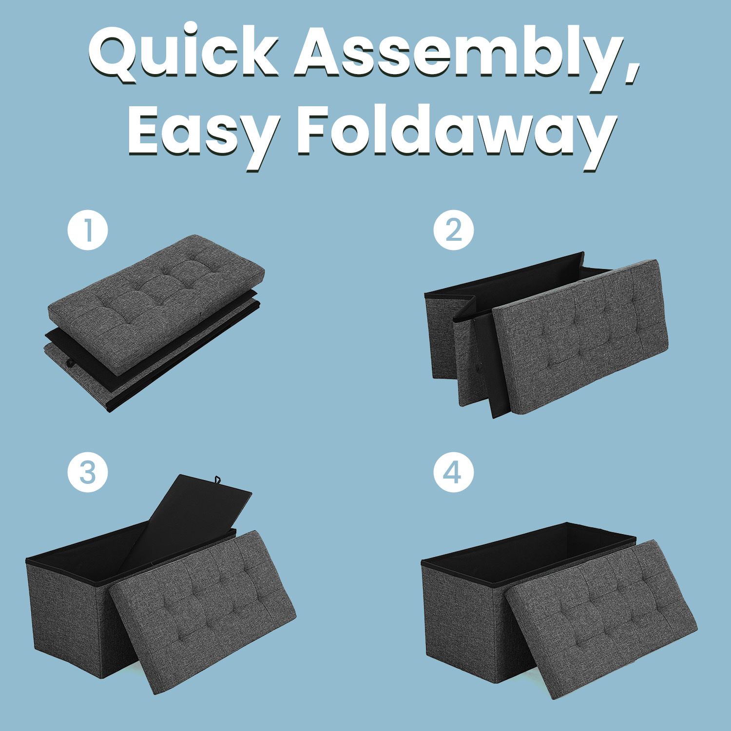 Declutter in style with this SONGMICS Folding Storage Bench. Crafted with a durable linen-look cover and a sturdy MDF frame, this 80L dark grey bench offers ample storage for blankets, toys, or books. Its convenient half-side lid allows easy access, while the foam padding provides comfortable seating. Perfect for living rooms, bedrooms, or entryways, it supports up to 300 kg and folds flat for easy storage.