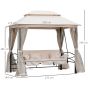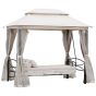 Relax comfortably outside with this swing chair bed from. With a steel frame for supreme strength and durability, it is crafted into a 2-in-1 design that comfortably seats three people upright and allows one person to sleep on. Securely attached to the gazebo canopy, the padded bed glides gently for a relaxing experience, with pillows for extra comfort. Four pull-back curtains on the gazebo ensure privacy when wanted, with zippable mosquito netting sewn in to protect you from any bugs. With a 2-tier canopy top to protect you from sun and showers, this swing chair gazebo is perfect for placing outside and drifting the day away.