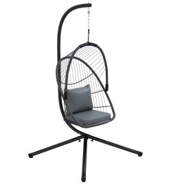 Outdoor PE Rattan Swing Chair with Cushion, Foldable Basket Patio Hanging Chair with Metal Stand, 360deg Rotation Spring Hook, Basket Height Adjust with Metal Chain, Grey
