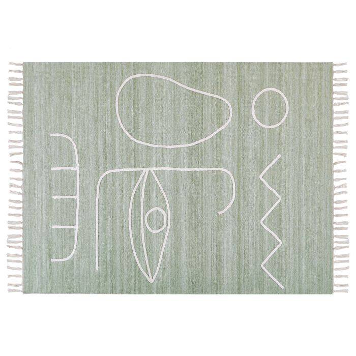 Decorate your room with this unusual, yet elegant in its simplicity, rug. It will be perfect for all traditional interiors as well as those in the Boho style in combination with wooden furniture. Moreover, the carpet will be a great addition to the living room or bedroom, as well as to the patio. Handmade from polyester, it is extremely easy to care for and long-lasting. Details: Color: Green, White. Main material: Polyester. Material Composition: 100% Polyester Weight: 5 Assembly: Does Not Require Assembly