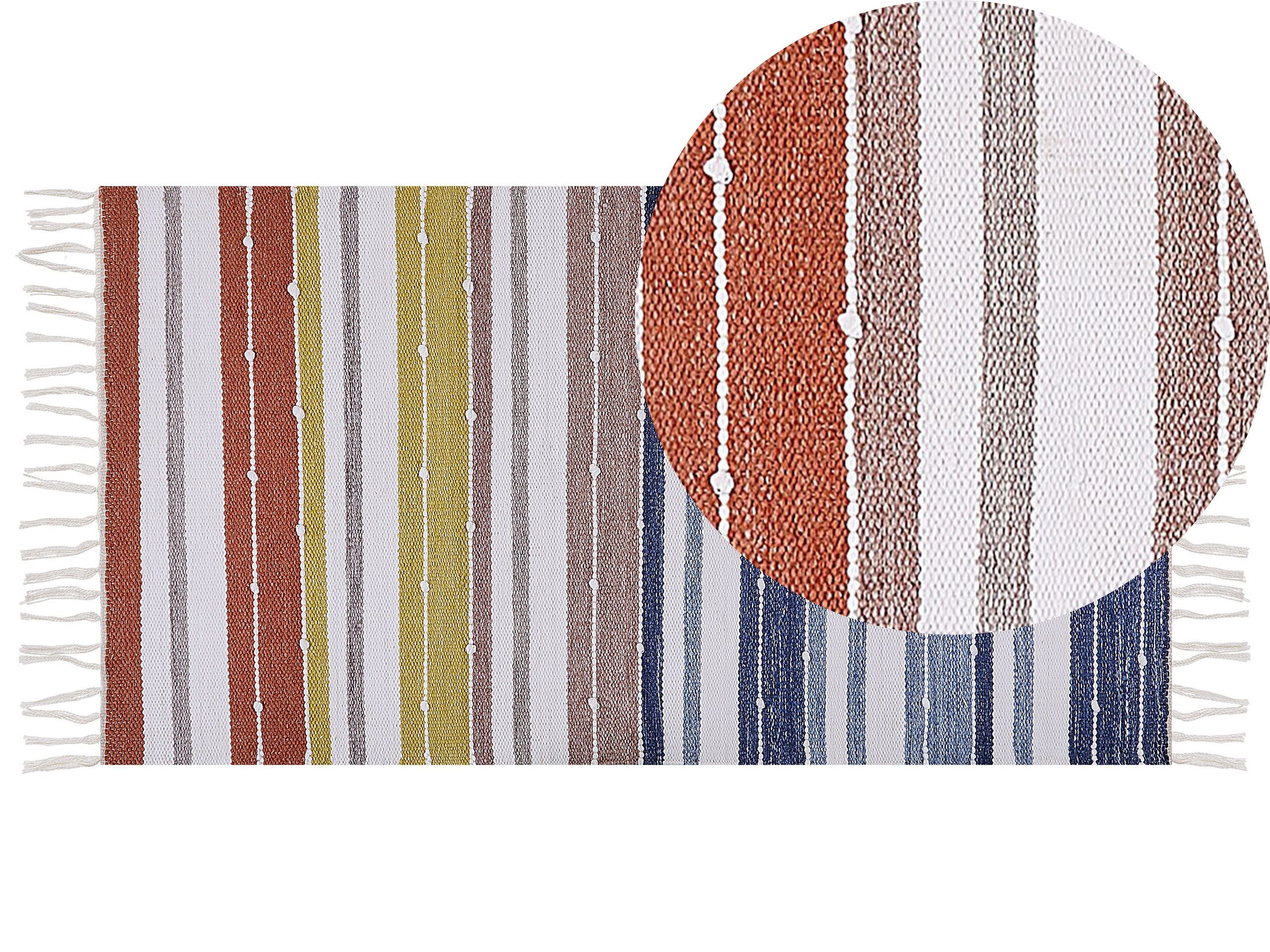 This rug will brighten up your interior and cheer you up. It features multicolour stripes with decorative tassels on the sides that will enliven every room. The rug was handmade from durable synthetic material, thanks to which it can be used both inside and outside. Put this rug either in your living room, bedroom or on your patio to enjoy this positive looking piece of accessory. Details: Color: Multicolour, Blue, White, Yellow, Red. Main material: Polyester. Material Composition: 100% Polyester Weight: 2 Assembly: Does Not Require Assembly