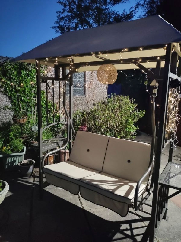 This 2 seater swing chair is a great addition to any outdoor living space, design with a metal frame with a canopy the chairs hang from the frame to give you the swinging motion. It also features two side tables on either side to hold drinks and accessories. Made from a rust resistant metal frame for strength and stability, with a weight capacity of 180Kg. The canopy cover is made from polyester allowing for shade from sunlight and light rain. The seating has 8cm thick cushions for ultimate comfort. This is a great piece of furniture and will match any outdoor Décor.