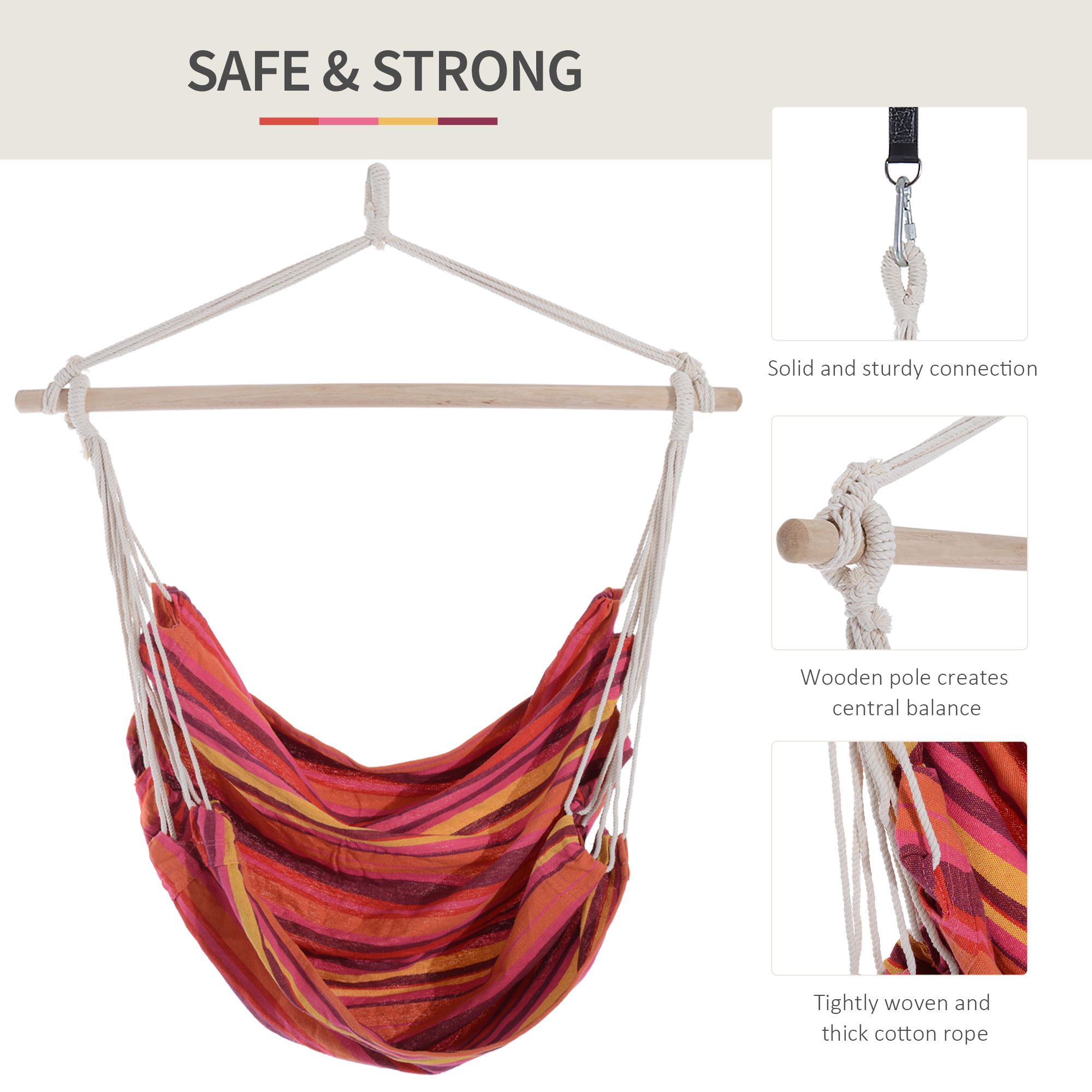 Sit back, relax and enjoy stylish outdoor lounging with the’s Hammock Chair! Made from the durable, breathable cotton material, it will offer you years of enjoyment. With wood stretcher thorough the swings chair to keep the chair stable! Relax outside and enjoy the fresh air with our hammock chairs