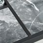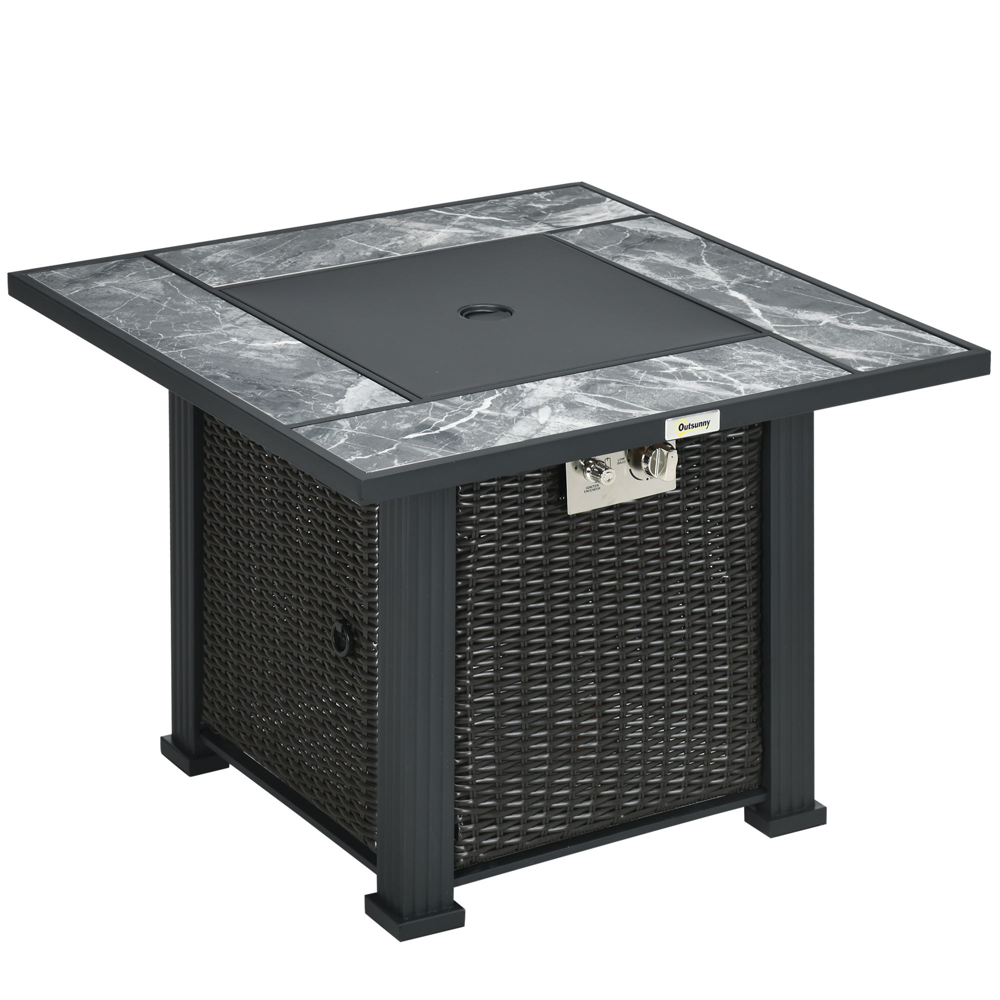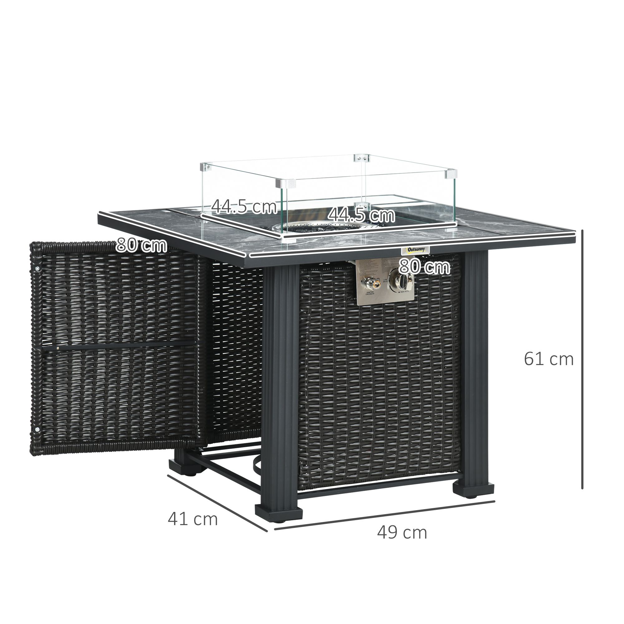 Outdoor PE Rattan Gas Fire Pit Table, Patio Square Propane Heater with Marble Desktop, Rain Cover, Glass Windscreen, and Glass Stones Black