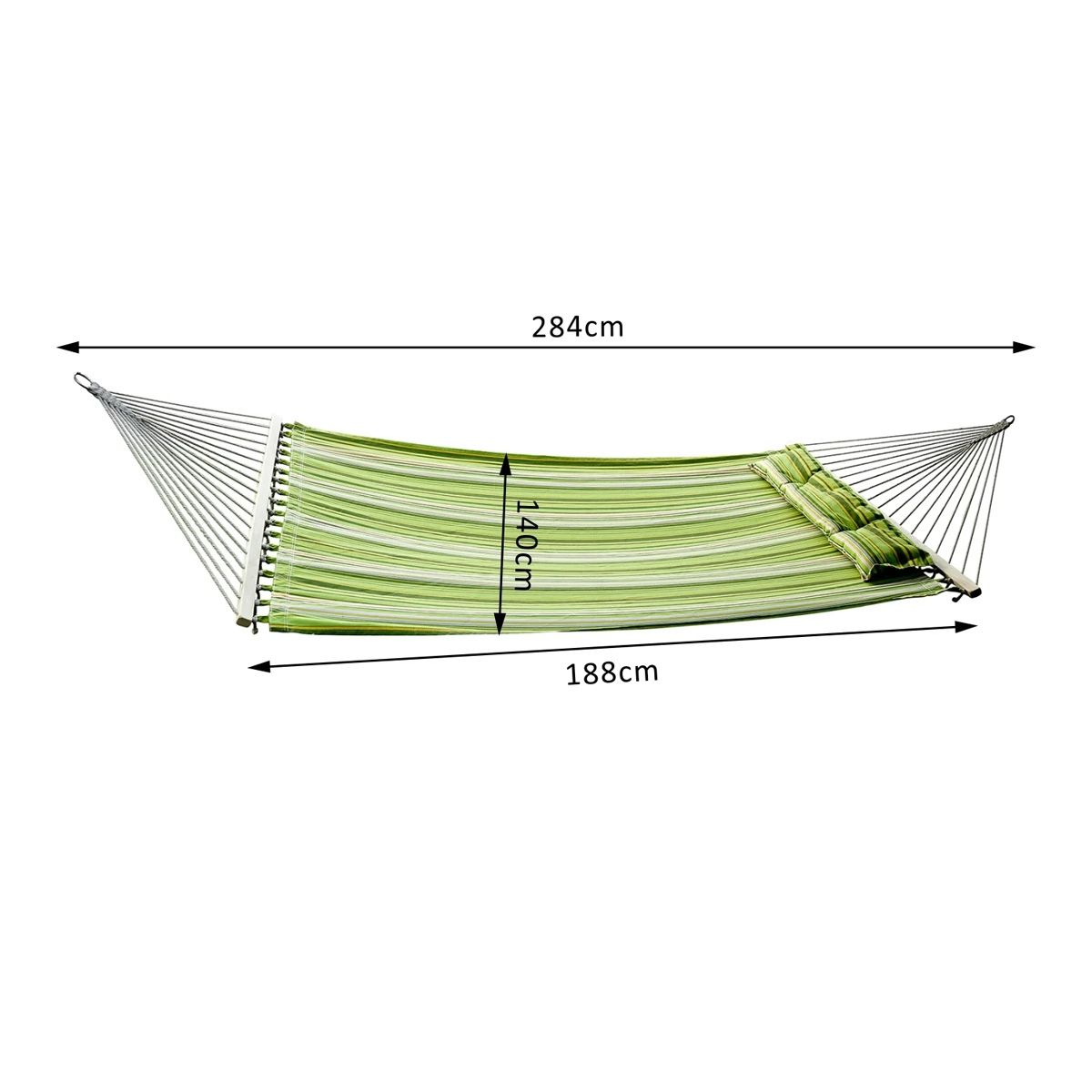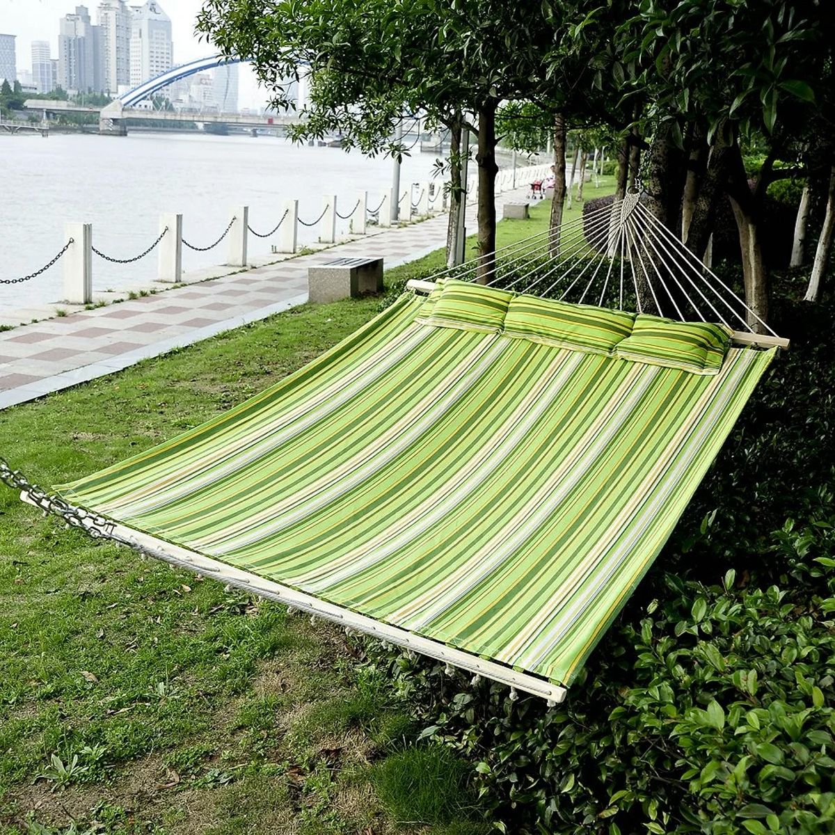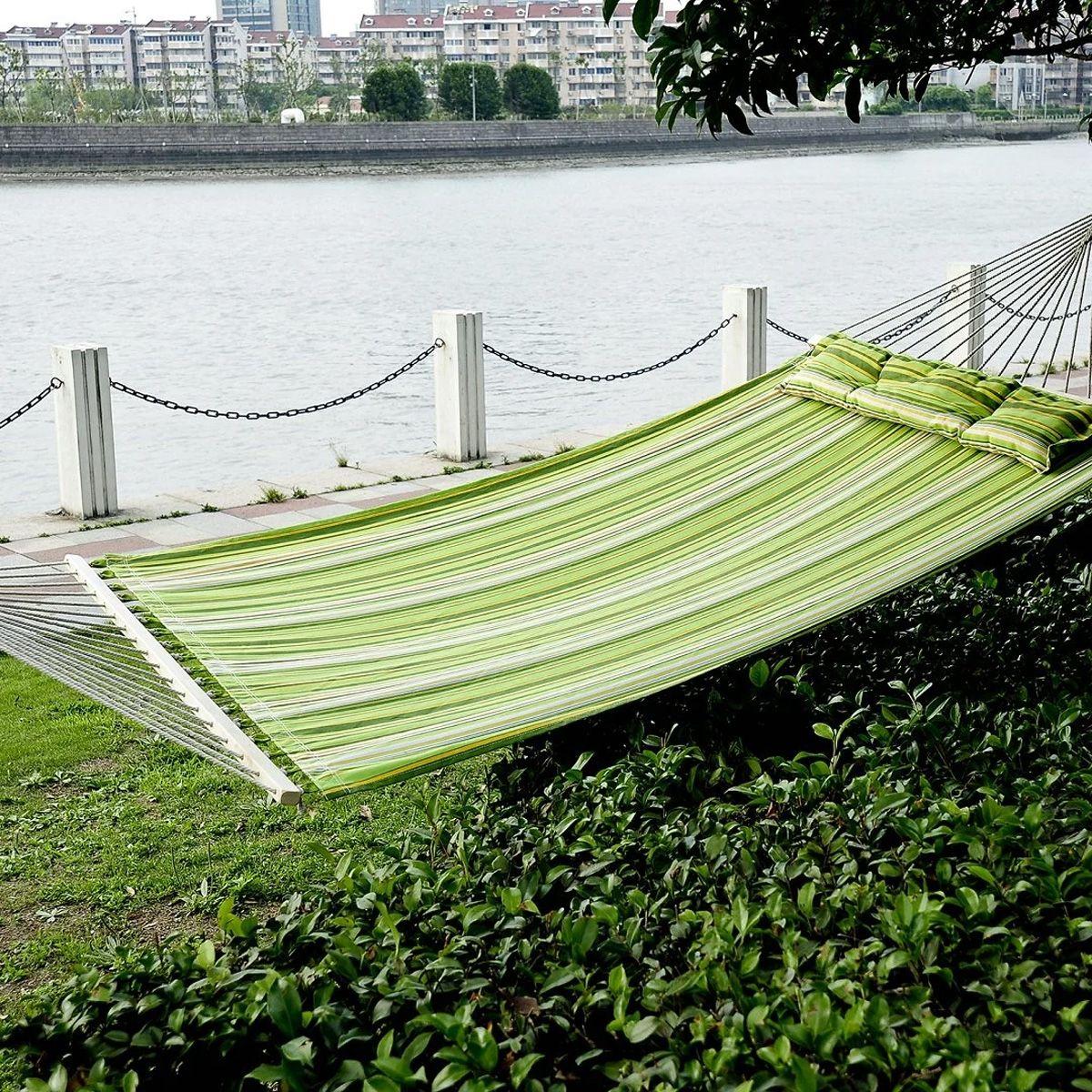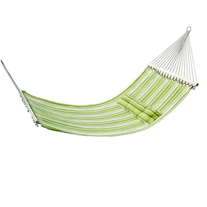 This multicolor hammock with pillow for double person is perfect for the outdoor garden use or indoor. The bed has 2 durable metal chains and 18 ropes to easy hanging and attaching. It provides maximum comforts for you when you are sleeping or reading on it. An ideal one for you to have for travel and camping.