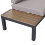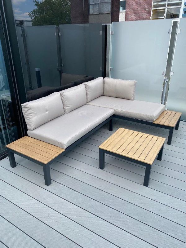 Take comfort back to basics with this three-piece outdoor dining set. All aluminium frame for added durability and strength, rust-resistant and lightweight for you to move everything around easily. Placed on the seat and the back, thick padded cushions ensure you’ll be sitting comfortably, slatted design coffee table and side extending desk on sofa giving it ample storage space and can be cleaned easily.