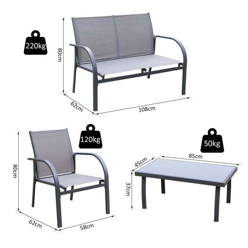 - Maximum weight loveseat: 220kg, chair: 120kg, table: 50kg