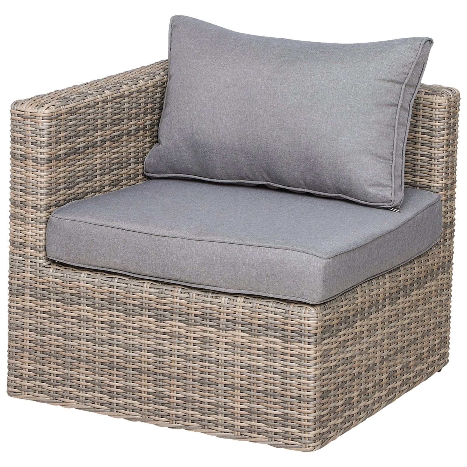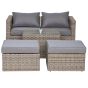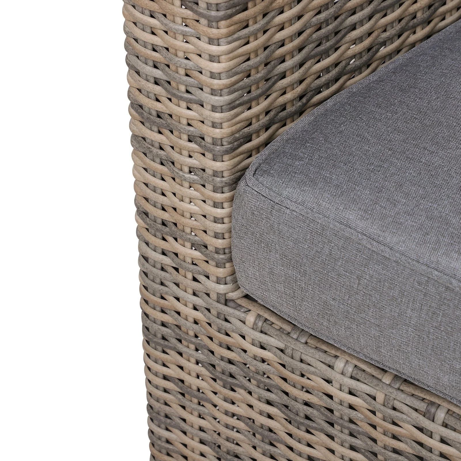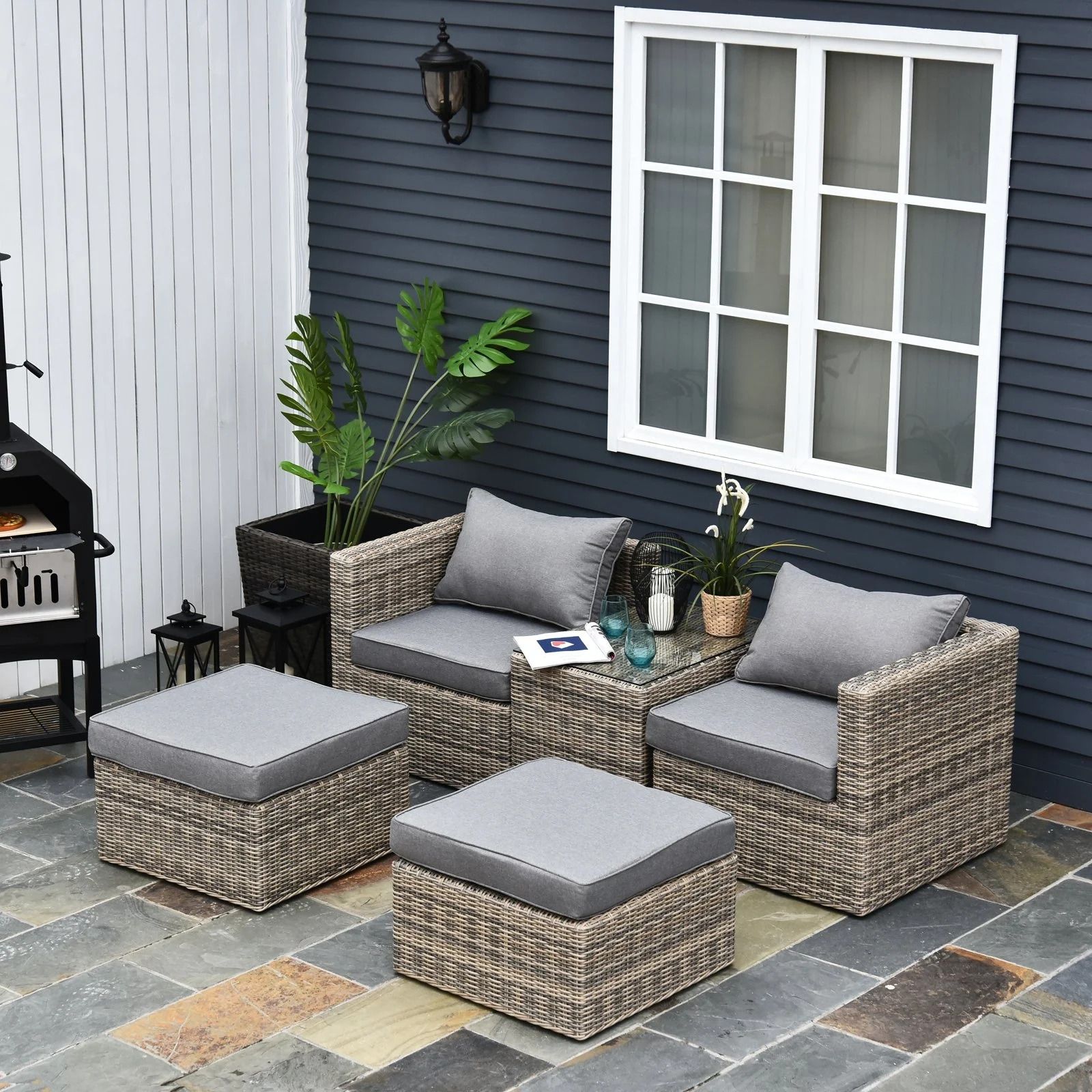 Look forward to those lazy afternoons ahead with this outdoor seating set. Totalling five pieces, the set includes two corner chairs, two footstools and a tall table, with solid aluminium forming the base frame for a robust structure, wrapped with PE wicker for a beautiful rattan look which is resistant to mild weathering and damage. Extra deep and wide in design to provide plenty of resting room, thick cushions are placed on the chair seats, the chair backs and the footstools for comfort, with removable and washable covers so you can keep them clean. Matching in height with the chairs, the round table is the perfect spot for keeping everything you need near, with beautiful glass surface placed on top. A set to relax under the sun for seasons to come.