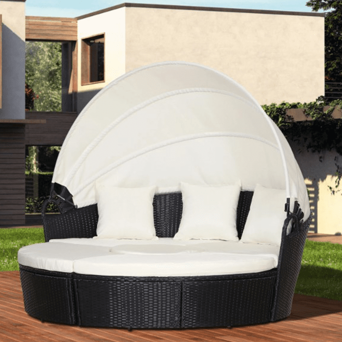 Boring patio? Brighten your backyard with this 5-Piece Cushioned Outdoor Rattan Wicker Sofa Daybed with Canopy Sectional Patio Furniture Set and make the outside of your home just as inviting as the inside. Oftentimes, due to uncomfortable seating or simply a lack of furniture, many outdoor environments go underused or ignored completely. believes that you can change all that with a simple, budget-friendly investment in one of our designer outdoor furniture sets. Decorative and functional, our 5 piece furniture set creates an inviting setting you'll want to use year after year.