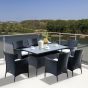 A modern 7pc rattan set from ideal for most outdoor living space. The set consists of 6 chairs and a rectangular table. All the seating come with cushions for your comfort, and the table has a tempered glass top. The fabric and cotton meet the British Bs5852 fire retardant standards. Easy to clean and maintain. Requires assembly.
