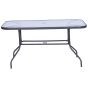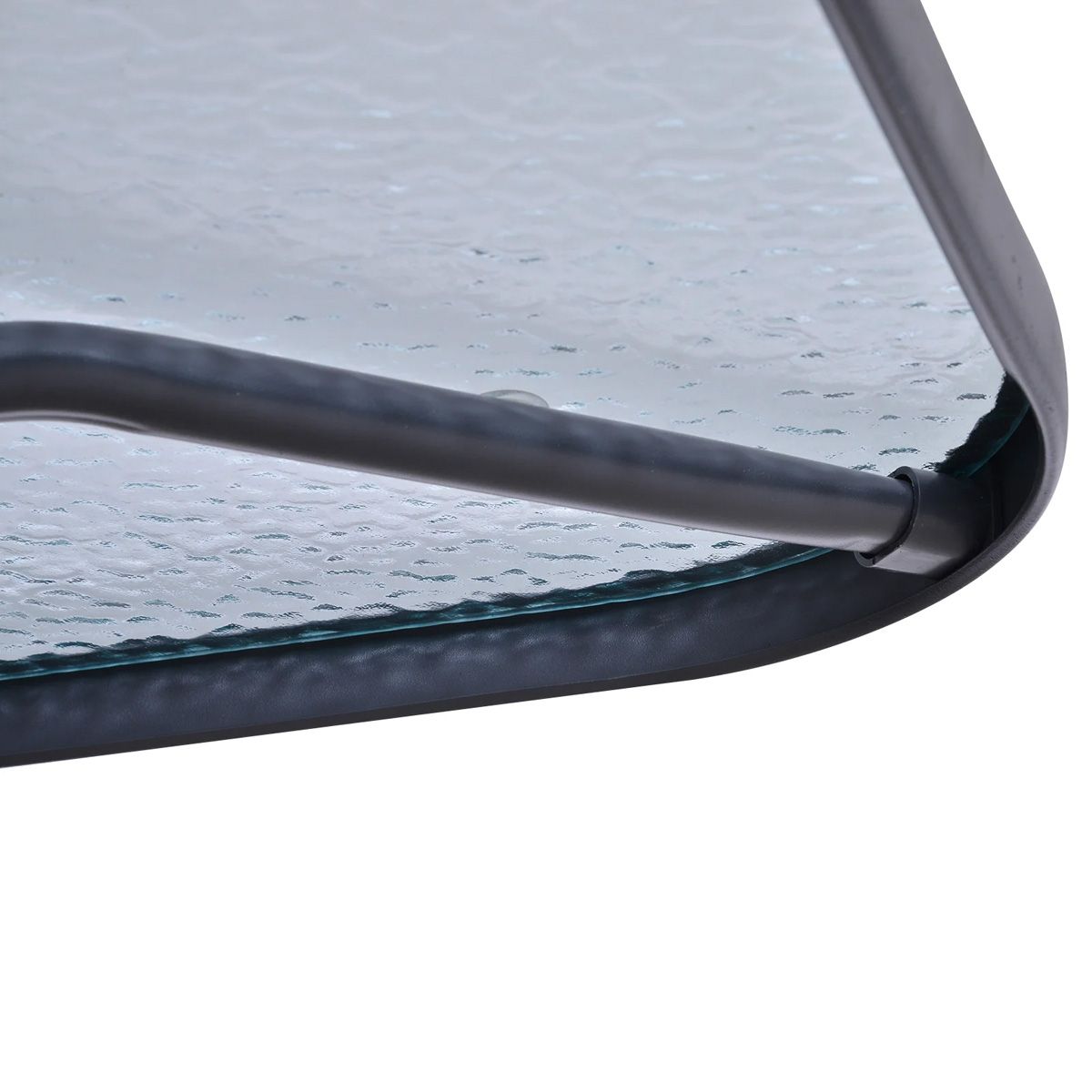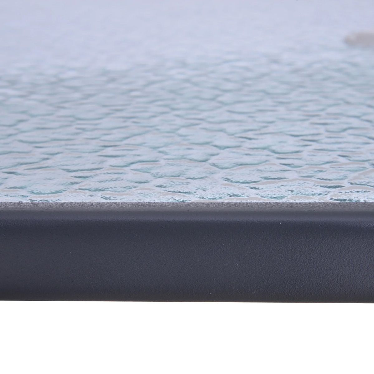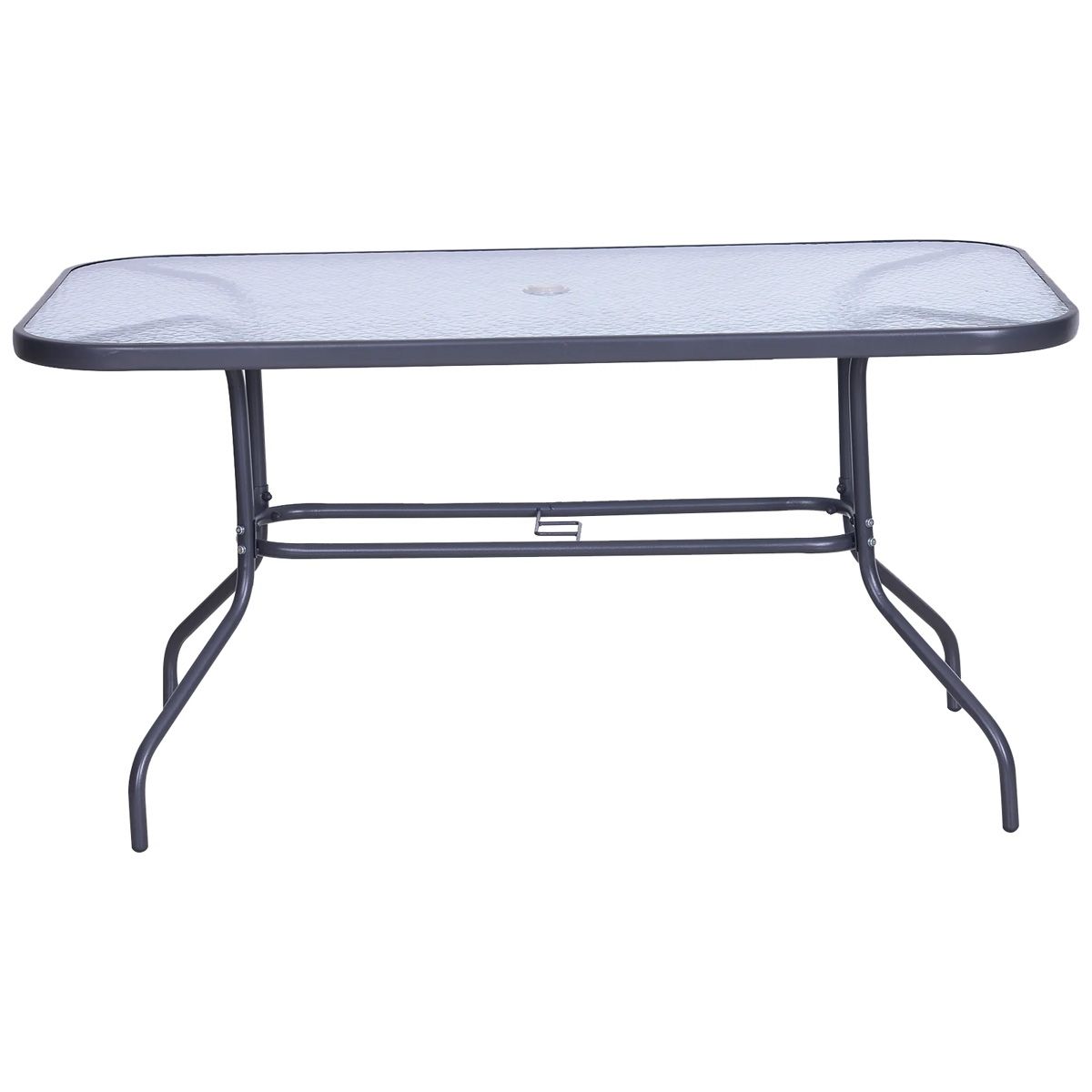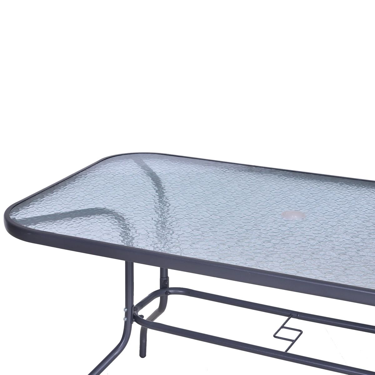 Effortlessly complement your outdoor set-up with this large table. A versatile design, which blends itself in with a large variety of garden dining sets, it uses thick metal for the smoothly curved frame for a stable structure, with four evenly spaced legs to provide balance when in use. Aquatex glass covers the whole of the top – a solid construction which is rippled all over for beauty and can be wiped clean easily, with a hole in the middle to place a sun umbrella for protective shade. A modern way to charm your guests when they visit.