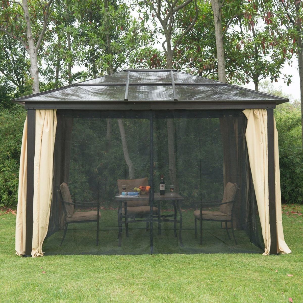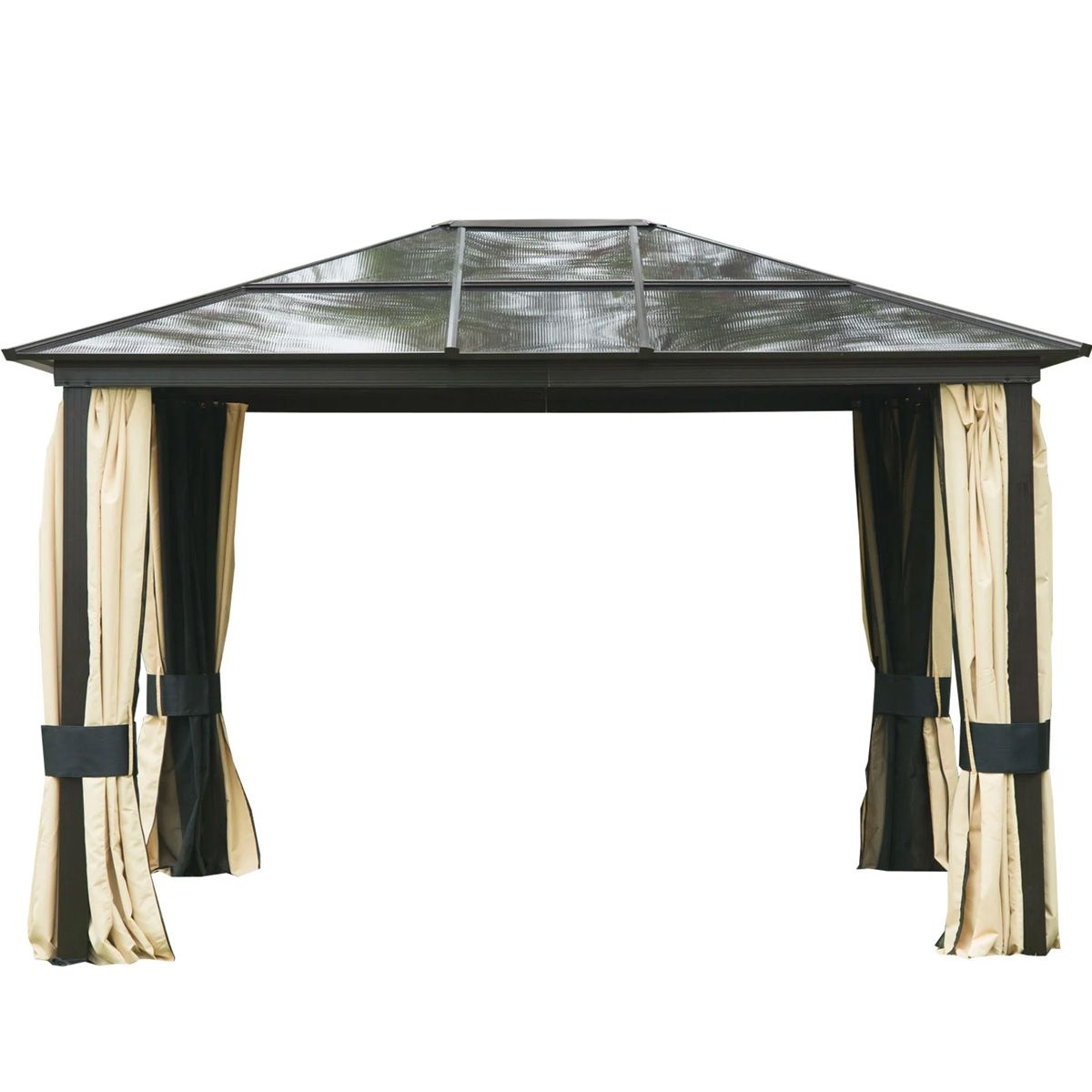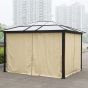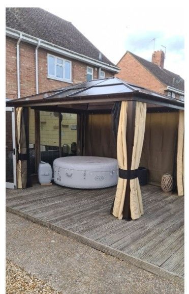 This brand new metal gazebo is constructed from high quality aluminum with a hard plastic top. Light can penetrate into polycarbonate roof panels. The structure is finished in brown with beige UV treated side covers. The polyester screens on the sides can open and close as you require, and the whole metal structure can offer shelter from the sun. Side wall can prevent unwanted pests from coming in, wind cover is also included. Take around with you and enjoy your outdoor life underneath. Please note, Velcro fasteners are required to hold back the curtain and are NOT supplied.