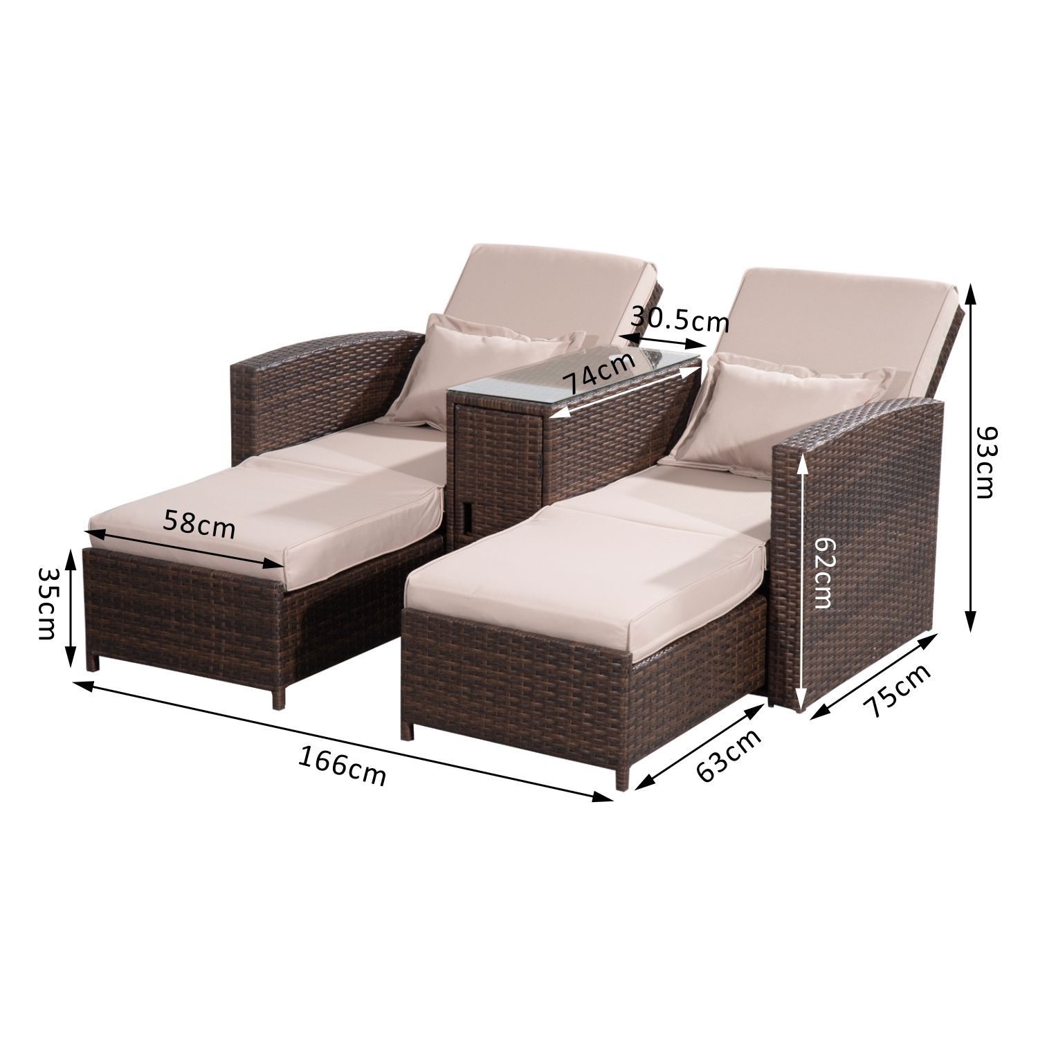 This comfortable rattan set comes complete with 2 adjustable loungers and a center table. The table top has a tempered glass piece to place any items you need to keep at easy reach. The lounger can be adjusted to 5 positions, to lay in comfort, The set offers flexibility and due to its lightweight construction can be easily positioned to suit any garden, patio or conservative.