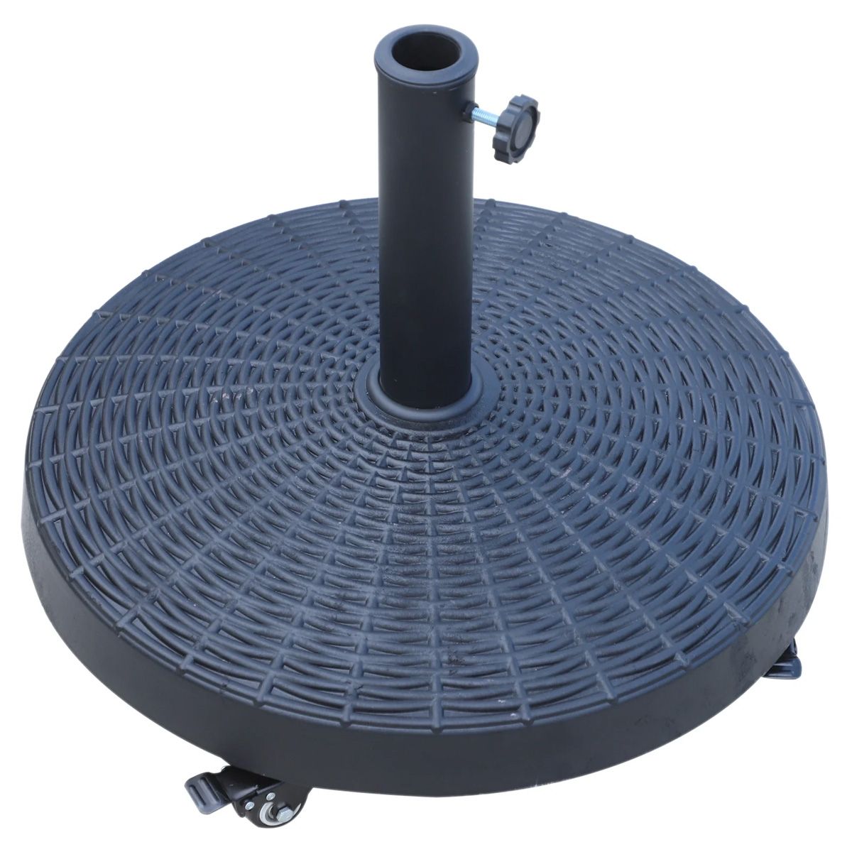 Keep you parasol umbrella securely in place with this base. Made from polyresin and steel for durability it is crafted into a stylish rattan style design to blend into your garden furniture seamlessly. Four wheels sit on the bottom for ease of movement with brakes to keep it in place when required. Finished with a tightening screw it will hold 38mm and 48mm pole diameters with ease. It’s great for keeping your sun shade in place all day long.