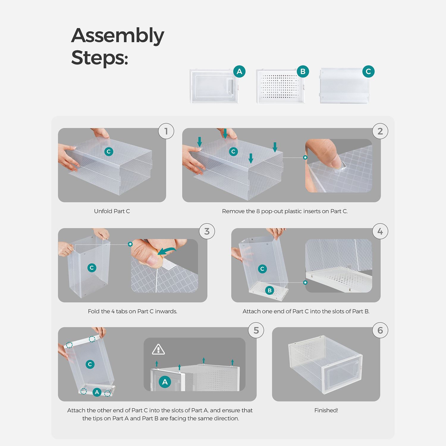 Do Away with Shoe Piles: Are you someone who shoves all your shoes into the closet in a big pile? Don't let your old habits get the best of you, keep them shapely, clean, and dry with this pack of 12 shoe boxes until you wear them for the next occasion or season.Organising Efficiency: Each container can hold shoes up to UK size 10.5, keeping the dust at bay. Find the pair you want to wear with a glance, and open the front door to easily grab it for the busy workday morning. What's even better is that these boxes are stackable for the entryway, closet, or a shelf.