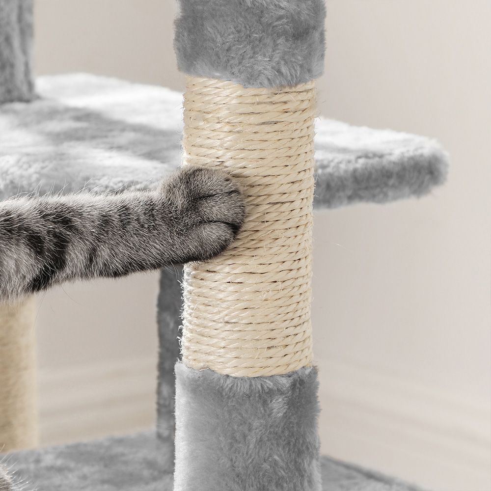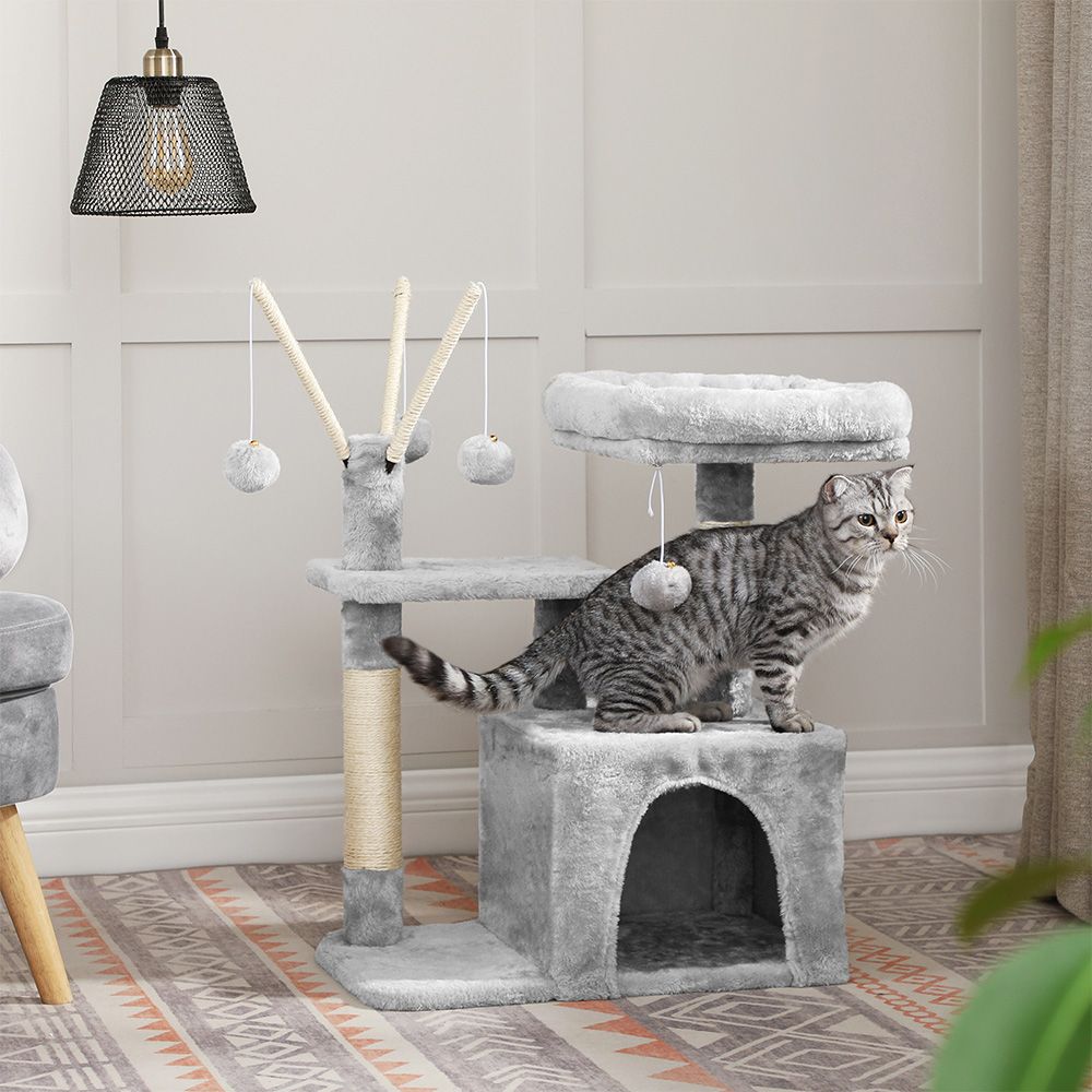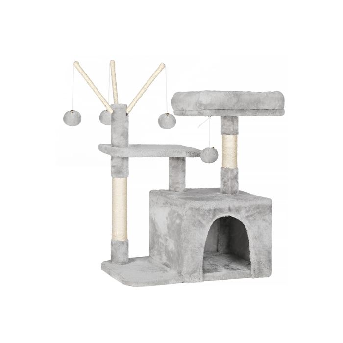 Inside the creative workshop of FEANDREA, two sweet kittens jump around, personally examining our scratching trees and giving their animal feedback. Thus, the designers of FEANDREA get to know firsthand whether the products meet the requirements of pampered whisker wearers.The highlights of the cat tree at a glance:3 pompoms for more fun;1 viewing platform for relaxation;1 comfortable cat cave for playing hide-and-seek;Soft plush fabric to make your cats feel like you're holding them in your arms.