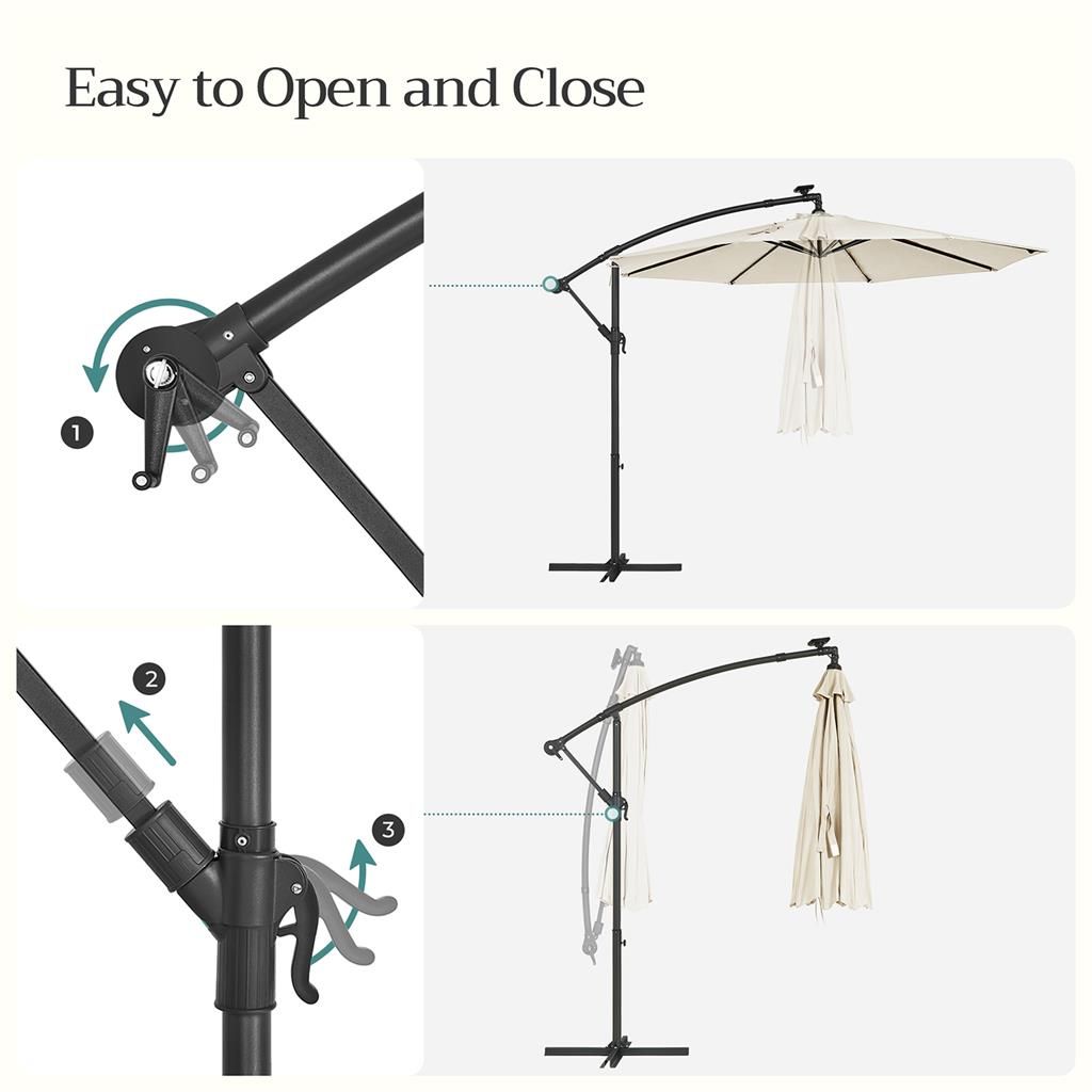 Package Contents:- 1 x Solar Cantilever Parasol- 1 x Solar Panel- 1 x Cross Base- 1 x Instructions