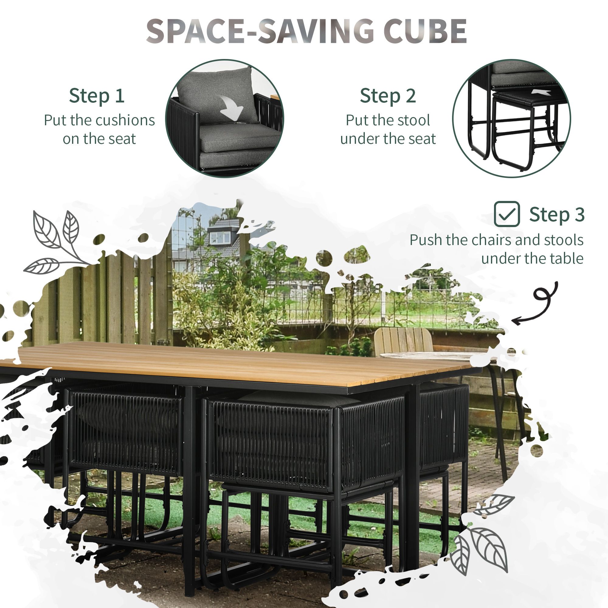 This eleven-piece set from creates an inviting setting, ideal for garden and other outdoor areas. Using rust-resistant metal for a solid frame, round PE wicker is woven around for extra durability and weather resistance. The wood grain plastic table top is super easy to clean and adds a sophisticated look. The ottomans and chairs nest neatly under the table for compact storage when not in use as a great space-saving solution. Family get-togethers never looked so stylish.