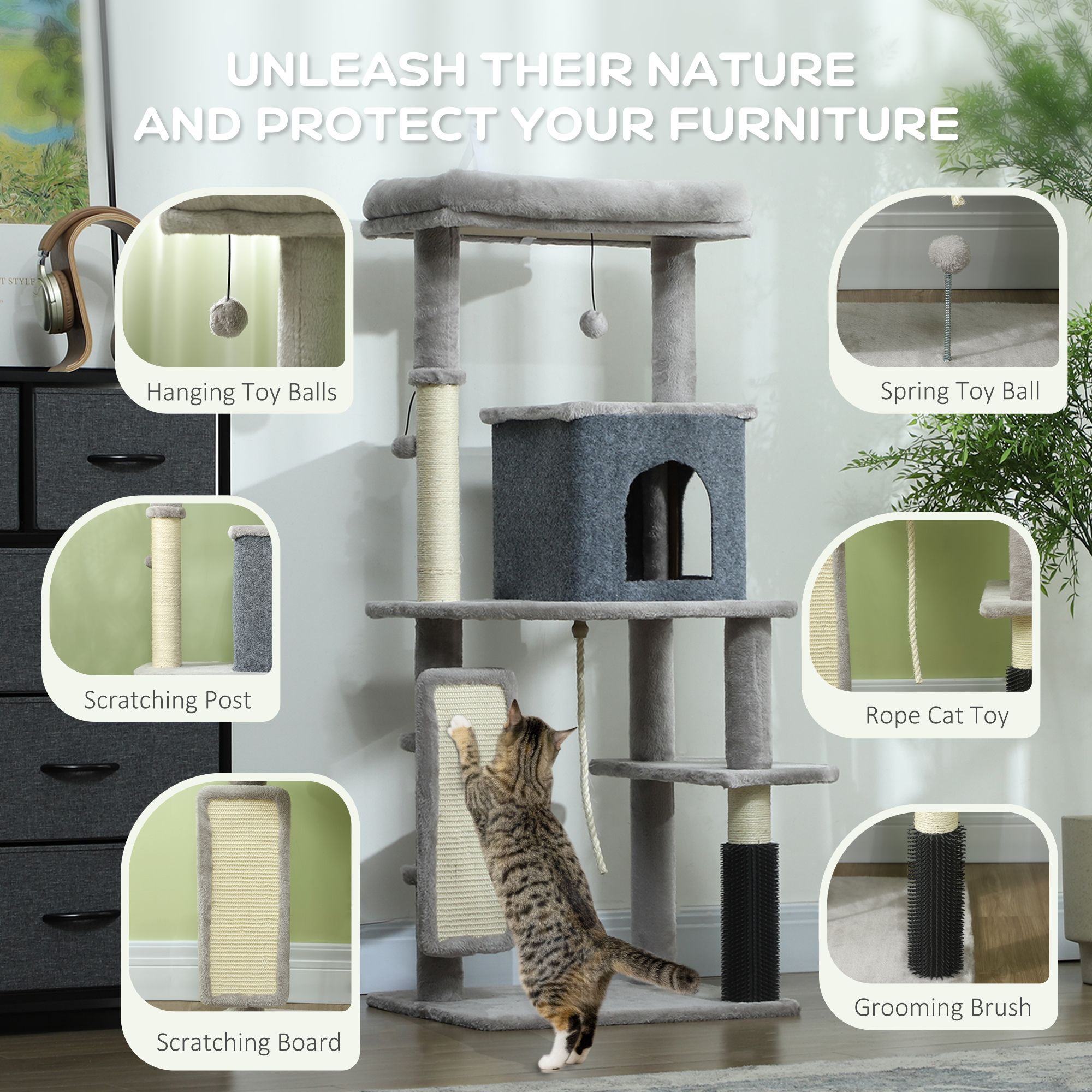 PAWSTER 132cm Cat Tree w/ Scratching Posts, Pad, Cat Bed, Cat House, Jumping Platform, Grooming Brush, Anti-Tip Kit, Light Grey