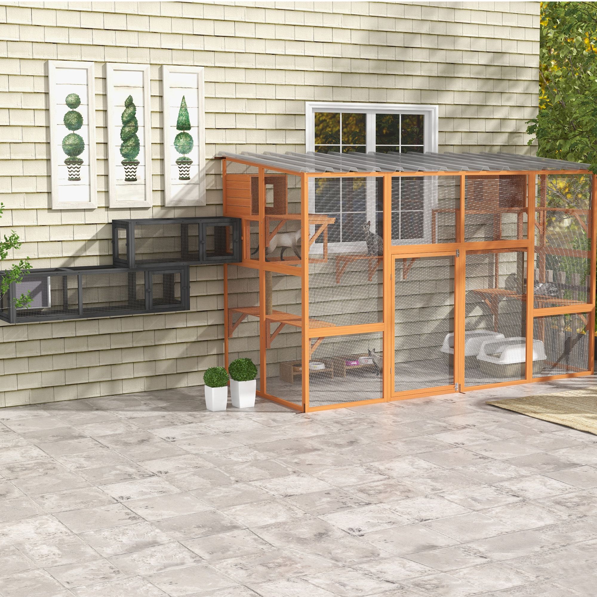 PAWSTER Cat Tunnel, 250cm Extra Long Wooden Cat Play Tunnel with 8 Doors, L-shape/Rectangle, Outdoor Cat Enclosures, Dark Grey