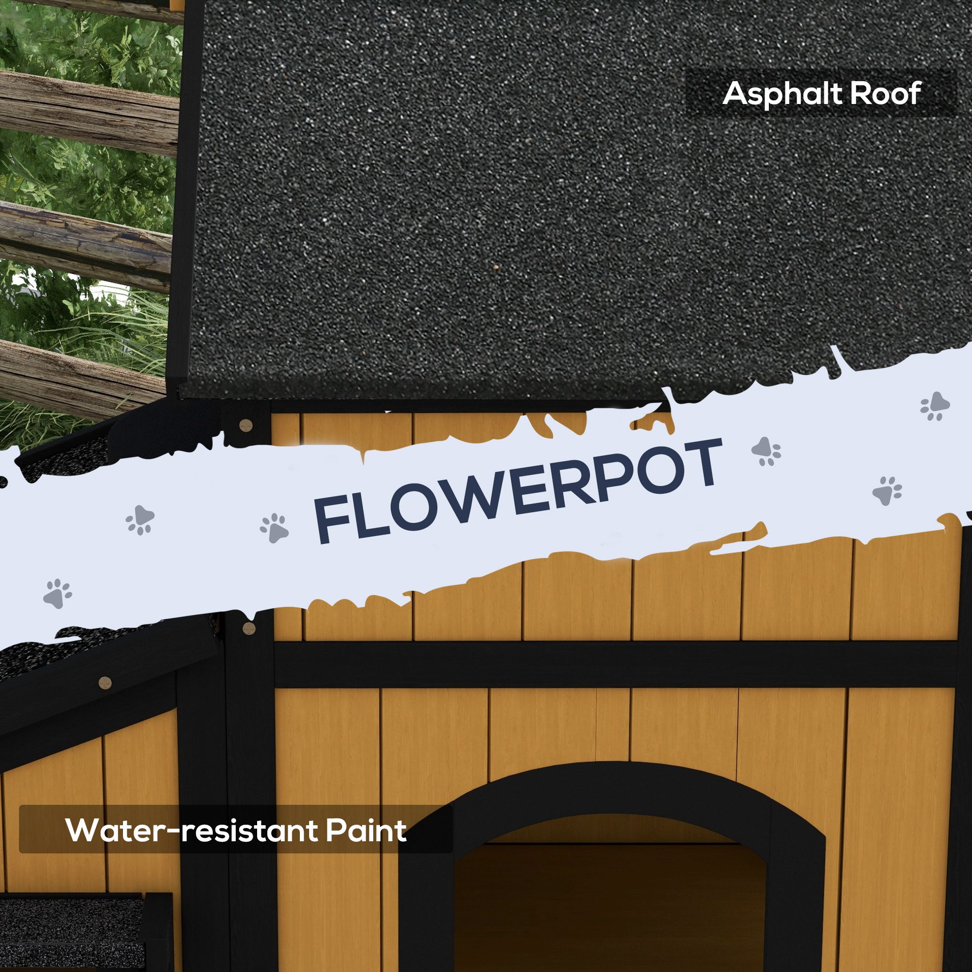 PAWSTER Wooden Cat House with Flower Pot, Windows, Multiple Entrances, Water-Resistant Roof for Outdoor - Yellow