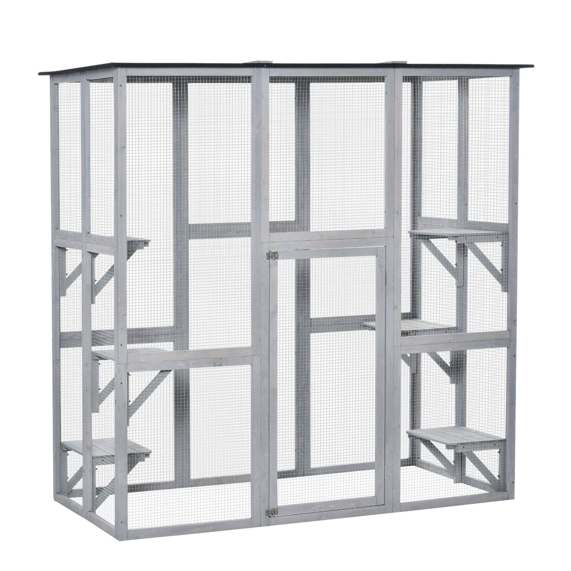 PAWSTER Wooden Catio Cat Outdoor Enclosure Cage Waterproof Roof Platforms - Grey