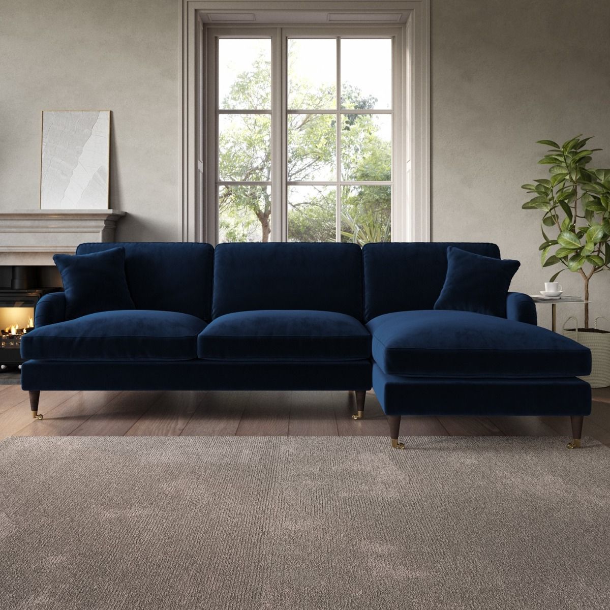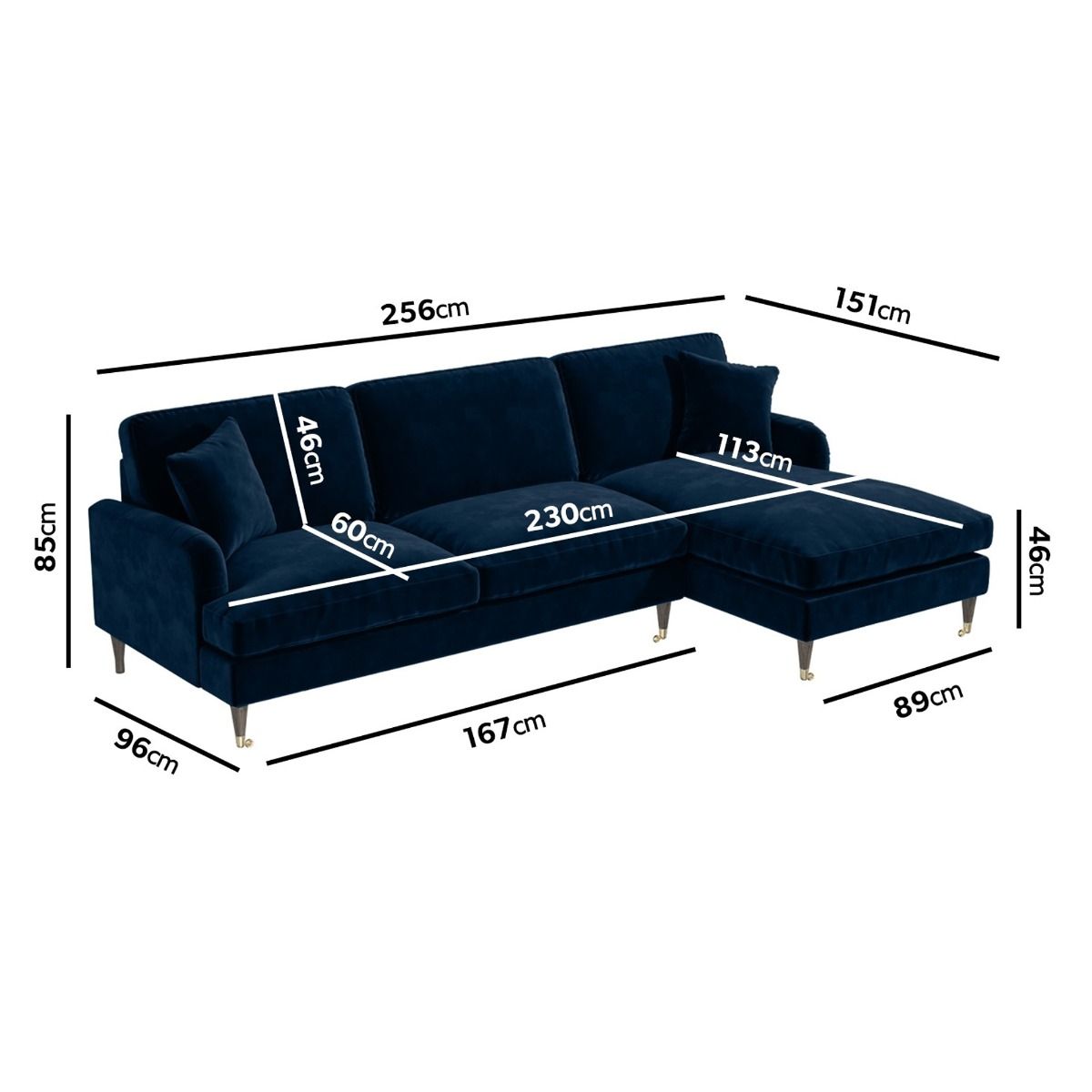 PAYTON Velvet 4 Seater L Shaped Fullback Corner Sofa - Navy Blue, Right Hand Facing