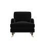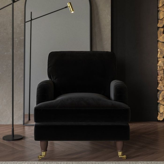 The Payton Armchair in Black is a stylish statement piece that offers exceptional comfort and timeless appeal. Upholstered in soft velvet fabric, it features a durable frame crafted from solid plywood and eucalyptus wood for long-lasting strength. Designed with plush cushions and elegant dark wood legs with gold detailing, it brings a touch of modern sophistication to any living space. Perfect for creating a cosy reading nook or completing your Payton sofa set, this armchair combines comfort, quality, and style. Please note: this model comes with fixed legs and non-removable castor wheels.