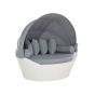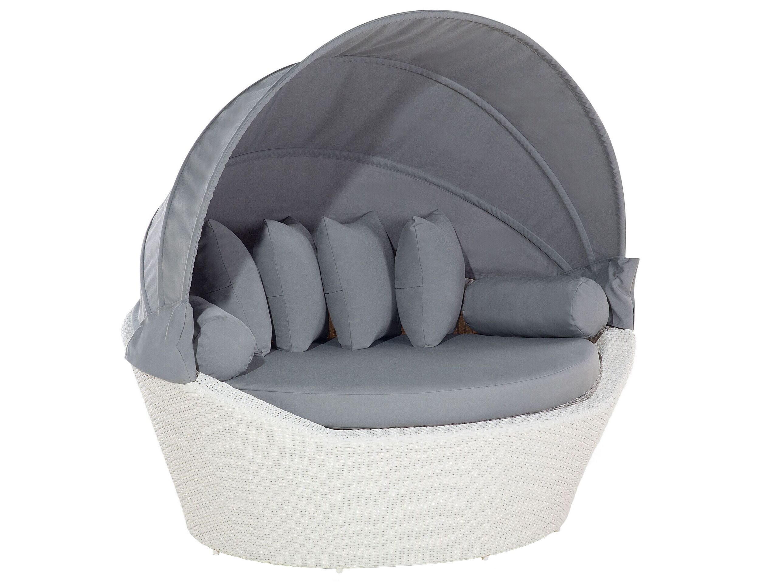 Lounge outside in style with this garden canopy daybed with a retractable sun cover. Furnished lavishly with cushions, the bed also keeps you cool with the convenient white canopy. The base is made of durable synthetic rattan that withstands diverse weather conditions. A powder-coated steel frame guarantees stability on uneven surfaces. The neutral colour palette is perfect for a range of garden designs. Details: Color: White, Grey. Main material: PE Rattan. Additional material: Polyester, Aluminium. Material Composition: 80% Cotton, 20% Polyester Weight: 26.5 Capacity: 2 People Assembly: Does Not Require Assembly Cushions Dimensions: 48x48 Legs Height: 1.5 Padding Thickness: 10 Seat Height: 43