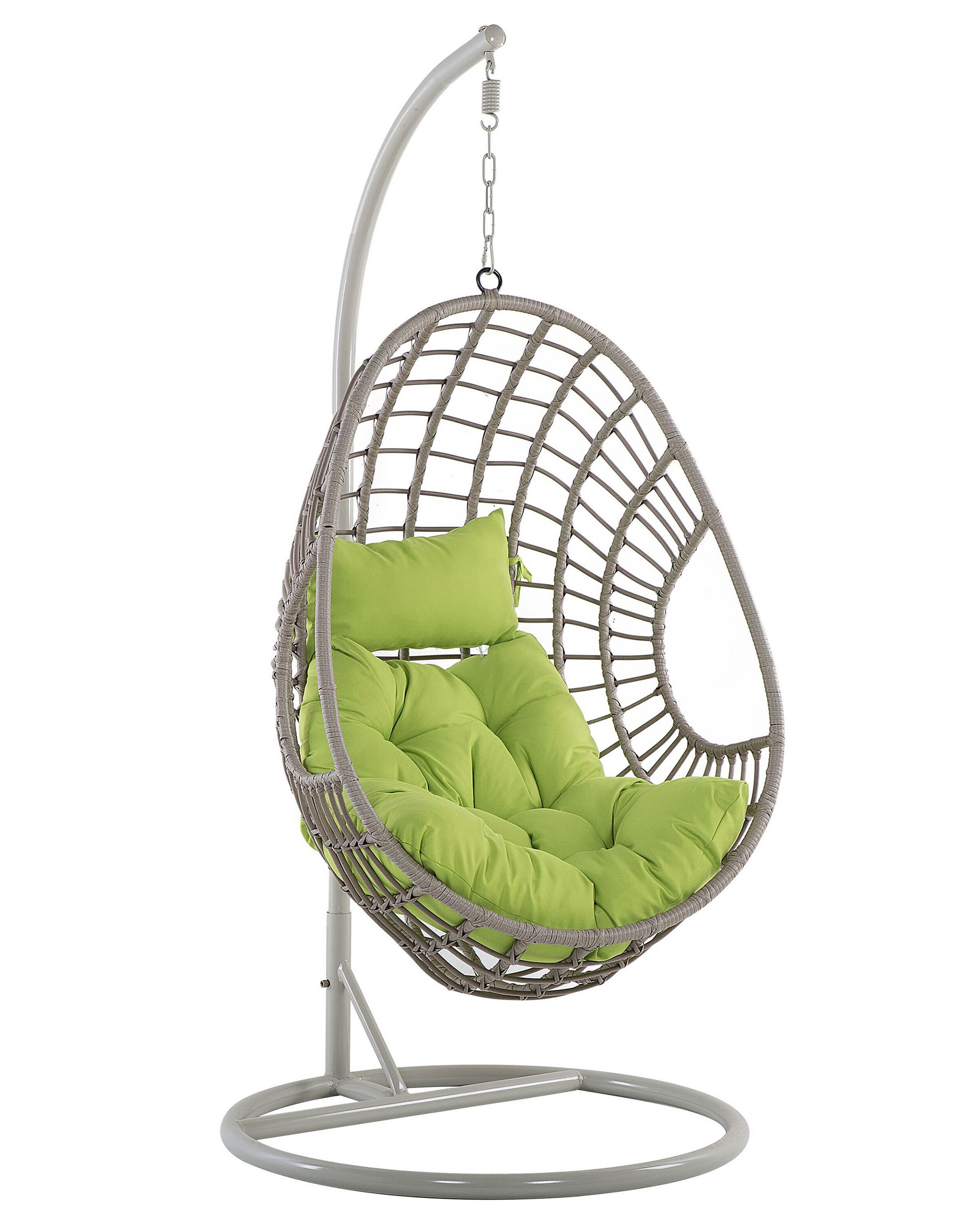 Undeniably pleasurable to lounge on, this swing chair is the perfect blend of vintage charm and modern character. Characterized by an exceptional comfort, its swooping silhouette hangs on a stable stand-alone frame allowing you to place it in any room of the house or conservatory. The openwork detailing made in robust PE wicker creates an airy, casual look. It comes complete with a sumptuous, tufted cushion and a head pillow in a refreshing shade of green. Details: Color: Natural, Green, Beige. Main material: PE Rattan. Additional material: Steel, Polyester. Material Composition: 100% Polyester Weight: 30 Assembly: Partial Assembly Required Weight Capacity: 90 Cushions Dimensions: 90x100 Padding Thickness: 15 Seat Height: 43