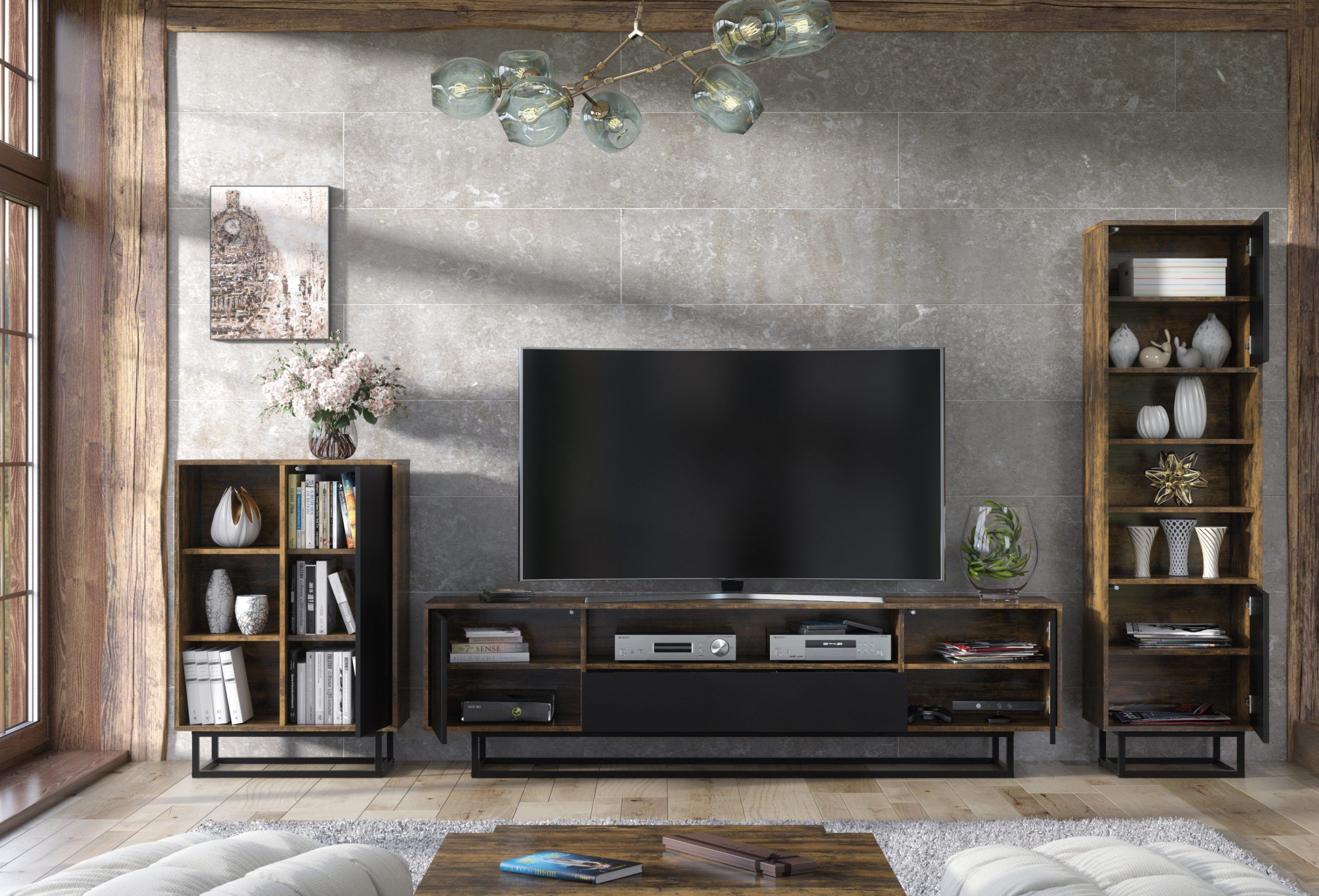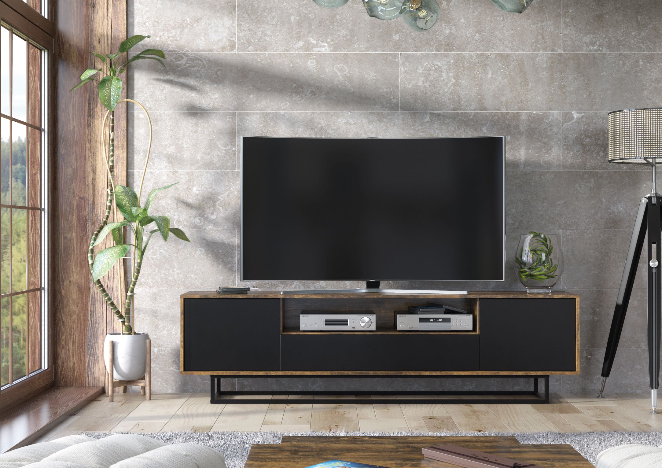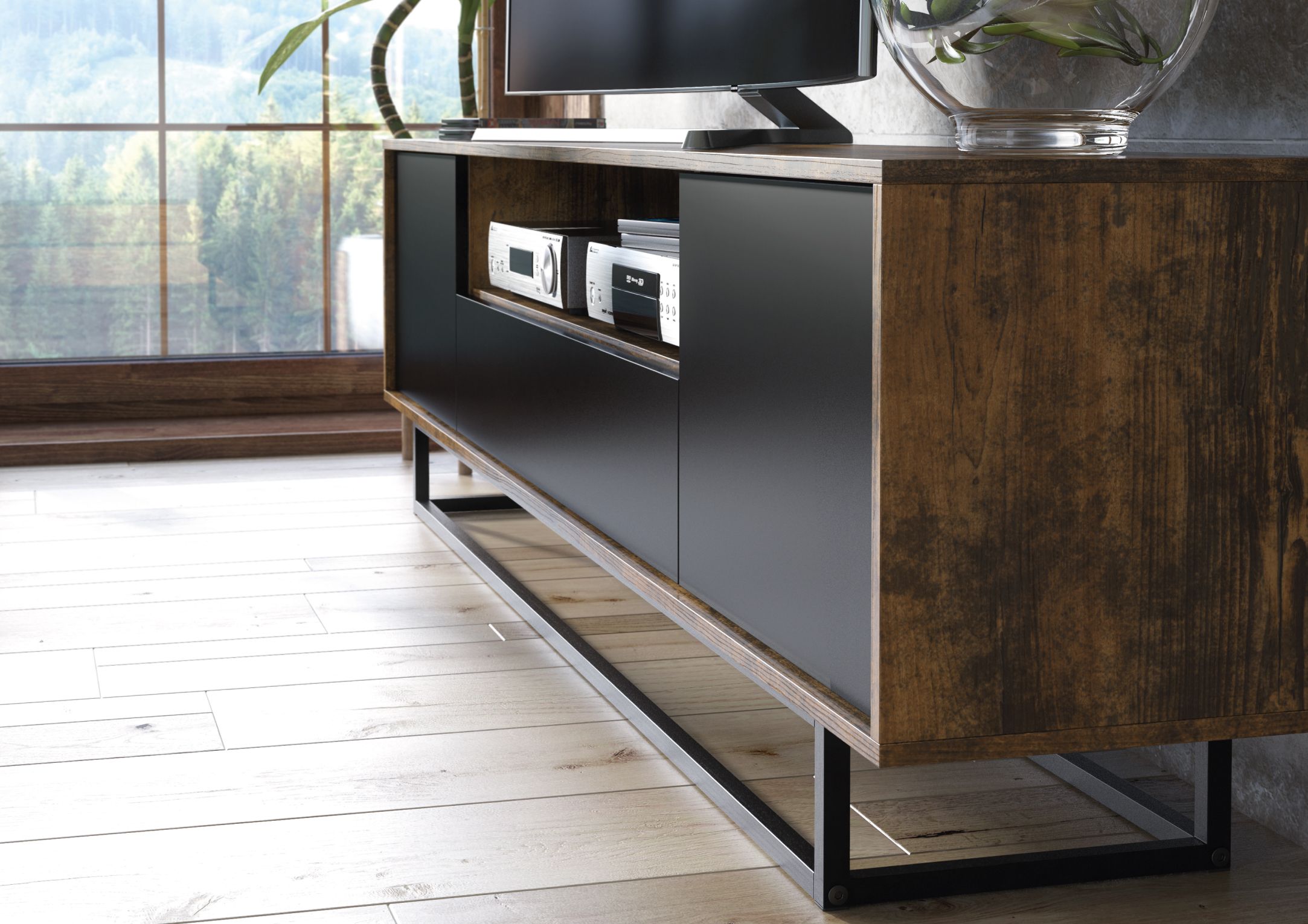 The PEARL Loft TV Unit combines industrial charm with contemporary design, making it the perfect centrepiece for your living room. Measuring 200cm (W) x 50cm (H) x 35cm (D), this unit is crafted from durable 16mm MDF and chipboard, ensuring lasting style and functionality. Bold black metal legs complement its clean lines, creating a loft-inspired aesthetic that suits any modern interior. Featuring two push-to-open doors on either side, it offers ample concealed storage for keeping your space tidy. A spacious drawer in the centre provides additional room for essentials such as remotes or gaming accessories, while the open compartment above is ideal for showcasing media devices or decorative pieces. Easy cable access at the back ensures a neat and organised entertainment setup. Available in warm, earthy finishes that bring character to your space, the PEARL Loft TV Unit is a standout addition to any home. Available in Dark Oak, Dark Oak & Black Matt Doors, and Rustic & Black Matt Doors.